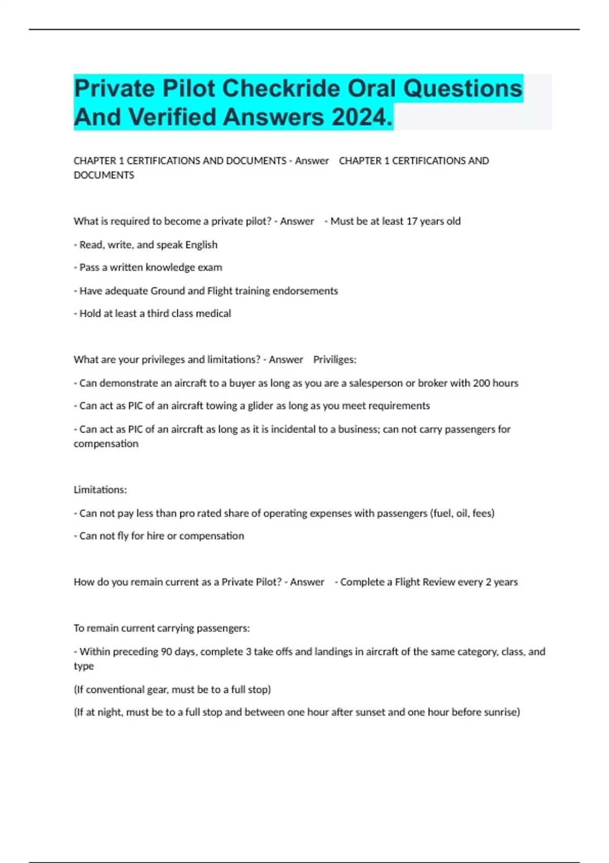 CHAPTER 1 CERTIFICATIONS AND DOCUMENTS - Answer CHAPTER 1 CERTIFICATIONS AND DOCUMENTS What is required to become a private pilot? - Answer - Must be at least 17 years old - Read, write, and speak English - Pass a written knowledge exam - Have adequate Ground and Flight training endorsements - Hold at least a third class medical What are your privileges and limitations? - Answer Priviliges: - Can demonstrate an aircraft to a buyer as long as you are a salesperson or broker with 200 hours - Can act as PIC of an aircraft towing a glider as long as you meet requirements - Can act as PIC of an aircraft as long as it is incidental to a business; can not carry passengers for compensation Limitations: - Can not pay less than pro rated share of operating expenses with passengers (fuel, oil, fees) - Can not fly for hire or compensation How do you remain current as a Private Pilot? - Answer - Complete a Flight Review every 2 years To remain current carrying passengers: - Within preceding 90 days, complete 3 take offs and landings in aircraft of the same category, class, and type (If conventional gear, must be to a full stop) (If at night, must be to a full stop and between one hour after sunset and one hour before sunrise)