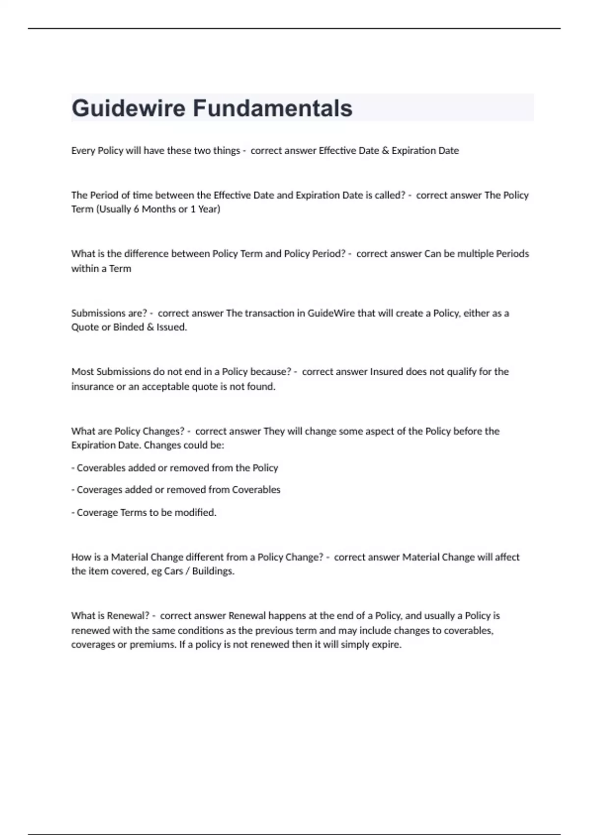 Guidewire Fundamentals Question and answers rated A+ Guidewire Fundamentals Every Policy will have these two things - correct answer Effective Date & Expiration Date The Period of time between the Effective Date and Expiration Date is called? - correct answer The Policy Term (Usually 6 Months or 1 Year) What is the difference between Policy Term and Policy Period? - correct answer Can be multiple Periods within a Term Submissions are? - correct answer The transaction in GuideWire that will create a Policy, either as a Quote or Binded & Issued. Most Submissions do not end in a Policy because? - correct answer Insured does not qualify for the insurance or an acceptable quote is not found. What are Policy Changes? - correct answer They will change some aspect of the Policy before the Expiration Date. Changes could be: - Coverables added or removed from the Policy - Coverages added or removed from Coverables - Coverage Terms to be modified. How is a Material Change different from a Policy Change? - correct answer Material Change will affect the item covered, eg Cars / Buildings. What is Renewal? - correct answer Renewal happens at the end of a Policy, and usually a Policy is renewed with the same conditions as the previous term and may include changes to coverables, coverages or premiums. If a policy is not renewed then it will simply expire.