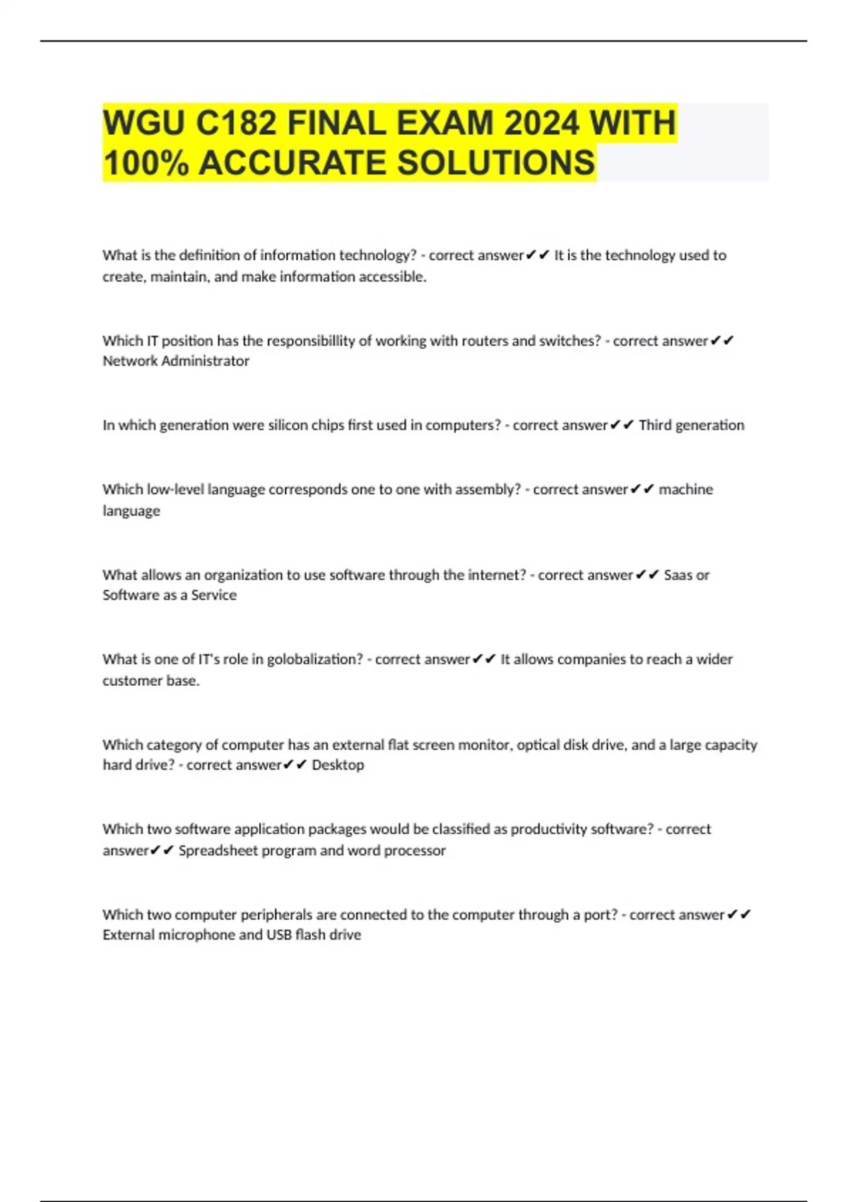 WGU C182 FINAL EXAM 2024 WITH 100% ACCURATE SOLUTIONS What is the definition of information technology? - correct answer It is the technology used to create, maintain, and make information accessible. Which IT position has the responsibillity of working with routers and switches? - correct answer Network Administrator In which generation were silicon chips first used in computers? - correct answer Third generation Which low-level language corresponds one to one with assembly? - correct answer machine language What