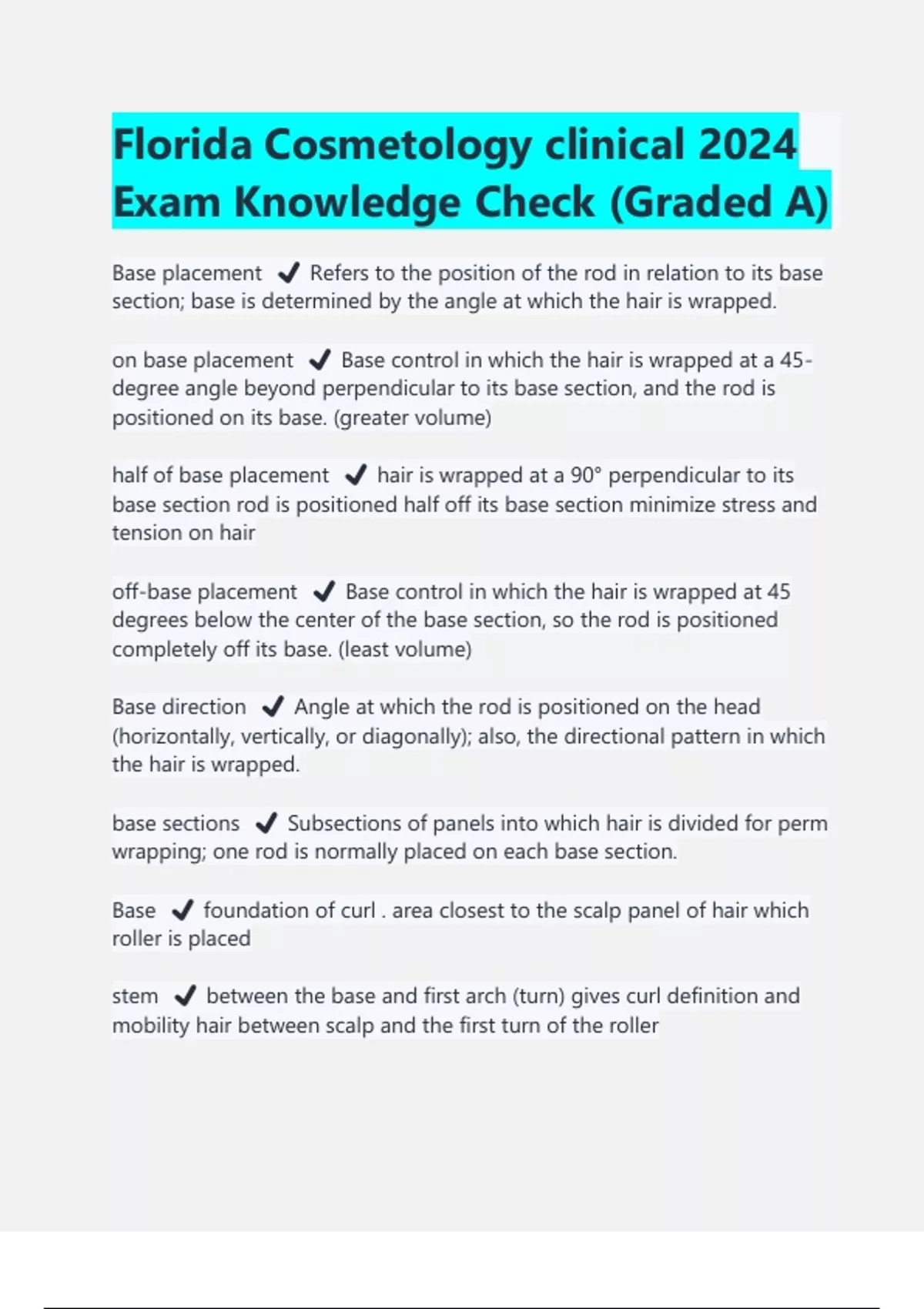 Florida Cosmetology clinical 2024 Exam Knowledge Check (Graded A) Base placement ️ Refers to the position of the rod in relation to its base section; base is determined by the angle at which the hair is wrapped. on base placement ️ Base control in which the hair is wrapped at a 45- degree angle beyond perpendicular to its base section, and the rod is positioned on its base. (greater volume) half of base placement ️ hair is wrapped at a 90° perpendicular to its base section rod is positioned half off its base section minimize stress and tension on hair off-base placement ️ Base control in which the hair is wrapped at 45 degrees below the center of the base section, so the rod is positioned completely off its base. (least volume) Base direction ️ Angle at which the rod is positioned on the head (horizontally, vertically, or diagonally); also, the directional pattern in which the hair is wrapped. base sections ️ Subsections of panels into which hair is divided for perm wrapping; one rod is normally placed on each base section. Base ️ foundation of curl . area closest to the scalp panel of hair which roller is placed stem ️ between the base and first arch (turn) gives curl definition and mobility hair between scalp and the first turn of the roller