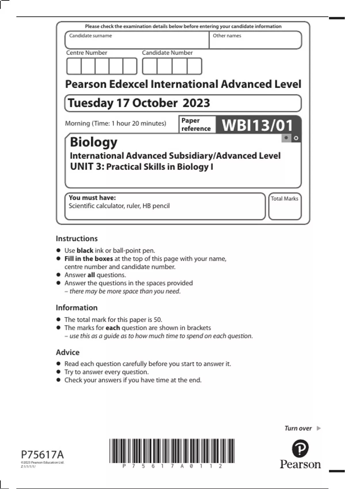 Pearson Edexcel International A Level Biology Paper 1 Question Paper 2023 (WBI13/01: Practical Skills in Biology I)