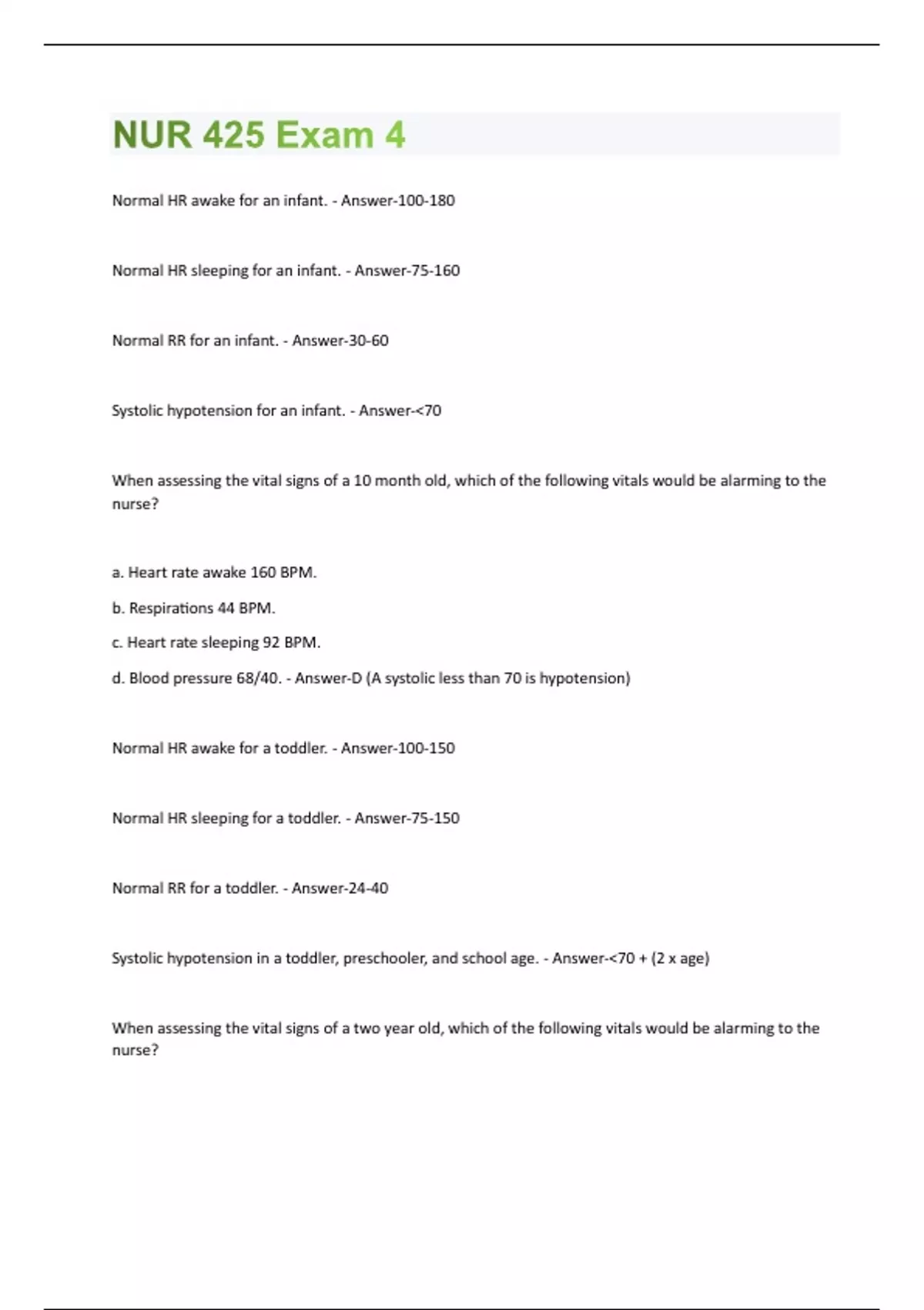 Normal HR awake for an infant. - Answer-100-180 Normal HR sleeping for an infant. - Answer-75-160 Normal RR for an infant. - Answer-30-60 Systolic hypotension for an infant. - Answer-<70 When assessing the vital signs of a 10 month old, which of the following vitals would be alarming to the nurse? a. Heart rate awake 160 BPM. b. Respirations 44 BPM. c. Heart rate sleeping 92 BPM. d. Blood pressure 68/40. - Answer-D (A systolic less than 70 is hypotension) Normal HR awake for a toddler. - Answer-100-150 Normal HR sleeping for a toddler. - Answer-75-150 Normal RR for a toddler. - Answer-24-40 Systolic hypotension in a toddler, preschooler, and school age. - Answer-<70 + (2 x age) When assessing the vital signs of a two year old, which of the following vitals would be alarming to the nurse?a. HR sleeping 60 BPM. b. HR awake 102 BPM. c. RR 32 BPM. d. BP 76/44. - Answer-A (HR sleeping should be 75-150.