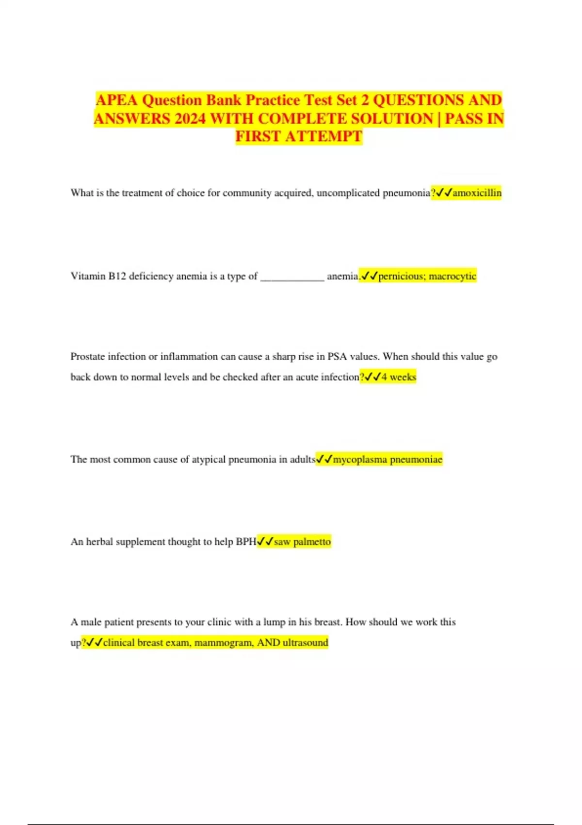 APEA Question Bank Practice Test Set 2 QUESTIONS AND ANSWERS 2024 WITH COMPLETE SOLUTION | PASS IN FIRST ATTEMPT What is the treatment of choice for community acquired, uncomplicated pneumonia?amoxicillin Vitamin B12 deficiency anemia is a type of ____________ anemia.pernicious; macrocytic Prostate infection or inflammation can cause a sharp rise in PSA values. When should this value go back down to normal levels and be checked after an acute infection?4 weeks The most common cause of atypical pneumonia in adultsmycoplasma pneumoniae An herbal supplement thought to help BPHsaw palmetto A male patient presents to your clinic with a lump in his breast. How should we work this up?clinical breast exam, mammogram, AND ultrasound