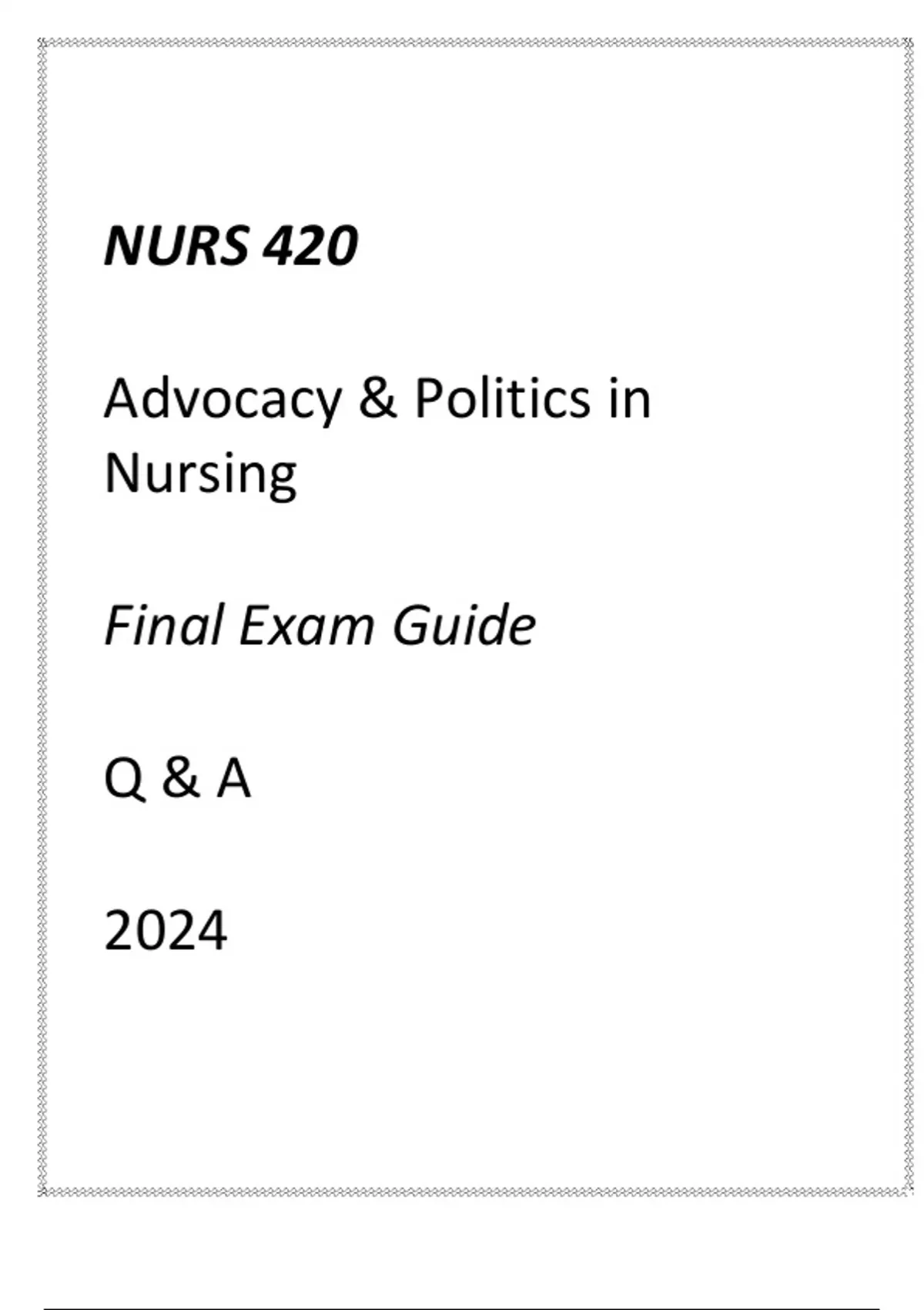 (UMGC) NURS 420 Advocacy & Politics in Nursing Final Exam Guide Q & A 2024(UMGC) NURS 420 Advocacy & Politics in Nursing Final Exam Guide Q & A 2024(UMGC) NURS 420 Advocacy & Politics in Nursing Final Exam Guide Q & A 2024(UMGC) NURS 420 Advocacy & Politics in Nursing Final Exam Guide Q & A 2024