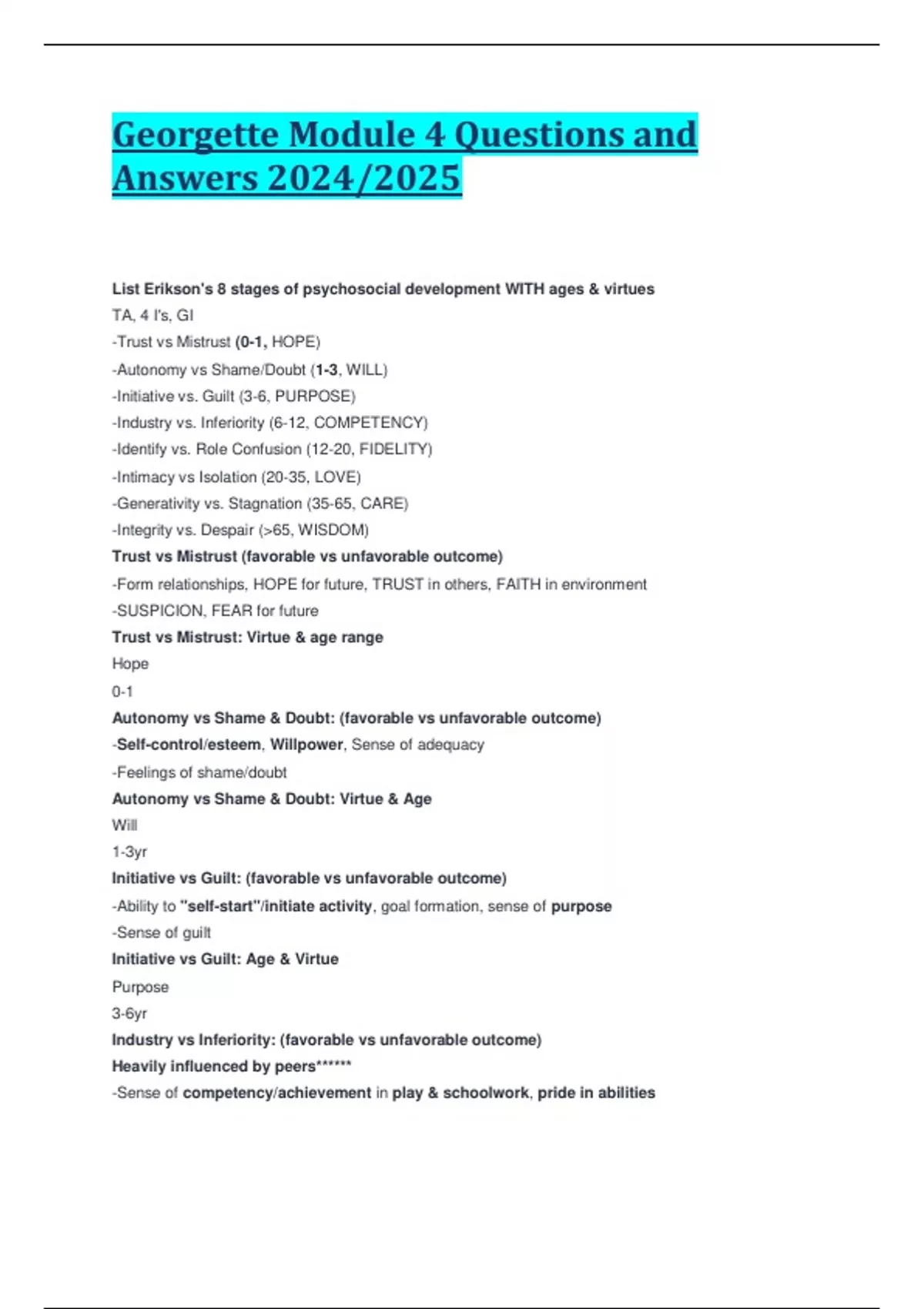 Georgette Module 4 Questions and Answers 2024/2025 List Erikson's 8 stages of psychosocial development WITH ages & virtues TA, 4 I's, GI -Trust vs Mistrust (0-1, HOPE) -Autonomy vs Shame/Doubt ( 1-3, WILL) -Initiative vs. Guilt (3 -6, PURPOSE) -Industry vs. Inferiority (6 -12, COMPETENCY) -Identify vs. Role Confusion (12 -20, FIDELITY) -Intimacy vs Isolation (20 -35, LOVE) -Generativity vs. Stagnation (35 -65, CARE) -Integrity vs. Despair (>65, WISDOM) Trust vs Mistrust (favorable vs unfavorable outcome) -Form relationships, HOPE for future, TRUST in others, FAITH in environment -SUSPICION, FEAR for future Trust vs Mistrust: Virtue & age range Hope 0-1 Autonomy vs Shame & Doubt: (favorable vs unfavorable outcome) -Self-control/esteem , Willpower , Sense of adequ acy -Feelings of shame/doubt Autonomy vs Shame & Doubt: Virtue & Age Will 1-3yr Initiative vs Guilt: (favorable vs unfavorable outcome) -Ability to "self -start"/initiate activity , goal formation, sense of purpose -Sense of guilt Initiative vs Guilt: Age & Virtue Purpose 3-6yr Industry vs Inferiority: (favorable vs unfavorable outcome) Heavily influenced by peers****** -Sense of competency/achievement in play & schoolwork , pride in abilities -Inferiority to understanding/organizing Industry vs Inferiority is heavily influenced by.... PEER RELATIONSHIPS , proficiency at play/school serve to develop competency Industry vs Inferiority: Age & Virtue 6-12yr Competency Identify vs Role confusion: (favorable vs unfavorable outcome) -Sense of identity /seeing self as unique/integrated -Confusion over who/what one really is Identify vs Role Confusion: Age & Virtue Fidelity 12-20yr Intimacy vs Isolation: (favorable vs unfavorable outcome) -Capacity to love & form committed relationship -Inability to form affectionate relationships Intimacy vs Isolation: Age & Virtue 20-35yr Love Generativity vs Stagnation: (favorable vs unfavorable outcome) -Care/concern for family/others/society (giving time/talents to them) -Care for oneself Generativity vs Stagnation: Age & VIrtue Care 35-65yr Integrity vs Despair: (favorable vs unfavorable outcome) -Fulfillment of one's life, willing to face death, INSIGHT , balanced life, sense of integrity -Dissatisfaction with life, despair over prospect of death Integrity vs Despair: Age & Virtue >65 yr Wisdom Typical age of onset for intellectual disability Infancy, usually evident AT BIRTH Typical age of onset for ADHD Early childhood (per DSM by age 12) Typical age of onset Schizophrenia Men 18 -25 Females 25 -35 Typical age of onset for MDD Late adolescence to young adulthood -More common in Females Typical age of onset for Dementia >65 Piaget vs Erikson question, do you go by age or stage? Erikson - KNOW THE AGE Piaget - go by presentation for stage Test taking st rategy, for Piaget & Freud questions If all answer choices related to Piaget or Freud tells you the behavior is wrong, but one that is normal --> answer is that one What are Piaget's 4 Stages of Cognitive Development, with age Sensorimotor (0 -2) Preoperatio nal (2 -7) Concrete (7 -12) Formal Operations (12 -adult) Sensorimotor 4 key things plus age 0-2yr **Object permanence** - the ability to understand that objects have an existence independent of the child’s involvement with them (that objects continue to exis t even though they can no longer be seen or heard) **Object constancy** - the ability to function and feel safe in a relationship where there is distance, contention, or conflict - **Absence does not mean disappearance/abandonment, only temp distance -Stranger anxiety -Experiences the world through senses Object permanence, is seen where & what is it Piaget Sensorimotor -describes child's ability to know that objects continue to exist even though they can no longer be seen or heard Ex. "Peek -a-boo", they smile b/c they know you're coming back. OR Ex. Hid a toy and they cry, they did not master this section b/c they think it stopped existing Object Constancy, is seen where & what is it? Piaget Sensorimotor -Allows us to trust that our bond with those who are close to us remains whole, even when they aren't physically around. **Absence does not mean disappearance/abandonment, only temp distance Ex. Parent goes to work, child won't cry b/c they know they'll come back