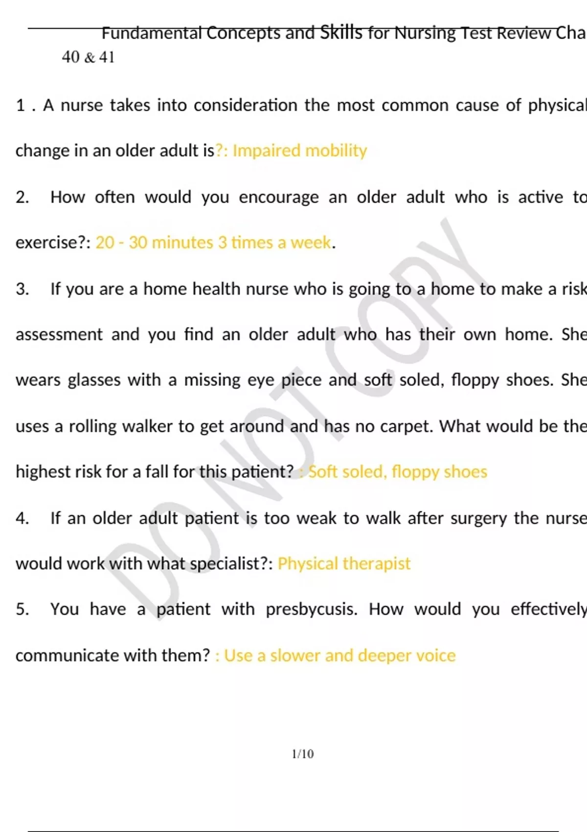 A nurse takes into consideration the most common cause of physical change in an older adult is?: Impaired mobility 2. How often would you encourage an older adult who is active to exercise?: 20 - 30 minutes 3 times a week.