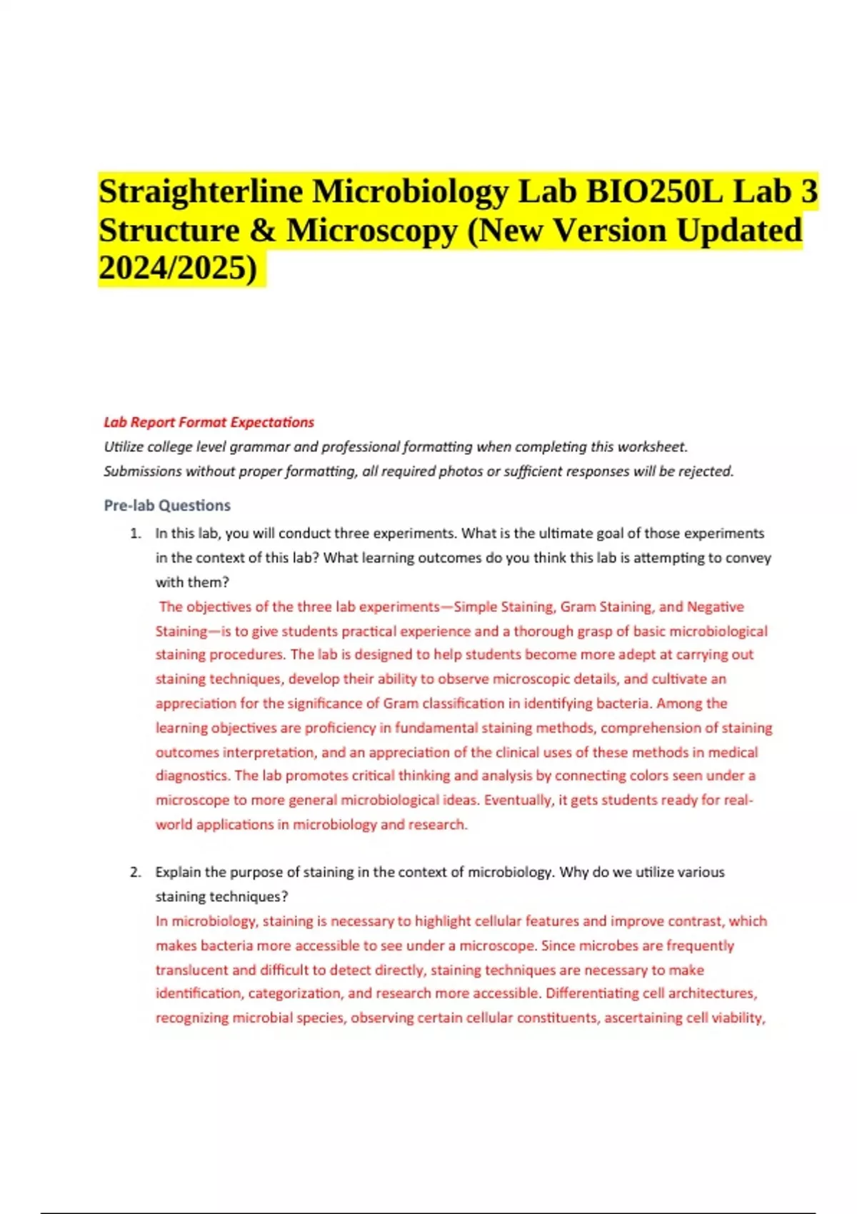 Straighterline BIO250L Microbiology Lab 3 Structure & Microscopy (New Version Updated 2024/2025) In this lab, you will conduct three experiments. What is the ultimate goal of those experiments in the context of this lab? What learning outcomes do you think this lab is attempting to convey with them? The objectives of the three lab experiments—Simple Staining, Gram Staining, and Negative Staining—is to give students practical experience and a thorough grasp of basic microbiological staining procedures. The lab is designed to help students become more adept at carrying out staining techniques, develop their ability to observe microscopic details, and cultivate an appreciation for the significance of Gram classification in identifying bacteria. Among the learning objectives are proficiency in fundamental staining methods, comprehension of staining outcomes interpretation, and an appreciation of the clinical uses of these methods in medical diagnostics. The lab promotes critical thinking and analysis by connecting colors seen under a microscope to more general microbiological ideas. Eventually, it gets students ready for realworld applications in microbiology and research. 2. Explain the purpose of staining in the context of microbiology. Why do we utilize various staining techniques? In microbiology, staining is necessary to highlight cellular features and improve contrast, which makes bacteria more accessible to see under a microscope. Since microbes are frequently translucent and difficult to detect directly, staining techniques are necessary to make identification, categorization, and research more accessible. Differentiating cell architectures, recognizing microbial species, observing certain cellular constituents, ascertaining cell viability, Straighterline Microbiology Lab BIO250L Lab 3 Structure & Microscopy (New Version Updated 2024/2025) Lab 3 Structure & Microscopy BIO250L and facilitating research and diagnostic applications are all accomplished through staining techniques. 3. Each experiment in this lab will cover a different staining technique. List those techniques below and provide a brief explanation of when each of those techniques would be used. Lab 3 Structure & Microscopy BIO250L ○ Gram Staining:Gram staining is used to distinguish between Gram-positive and Gramnegative bacteria based on the properties of their cell walls. ○ Acid-Fast Staining:is utilized to detect bacteria, such Mycobacterium species, that possess lipid-rich, waxy cell walls. ○ Endospore Staining:Endospores are hardy, inactive structures that some bacteria develop as a survival strategy. Endospore staining is used to find endospores. Lab 3 Structure & Microscopy BIO250L EXPERIMENT 1: SIMPLE STAINING Introductory Questions 1. What is the objective of Experiment 1?
