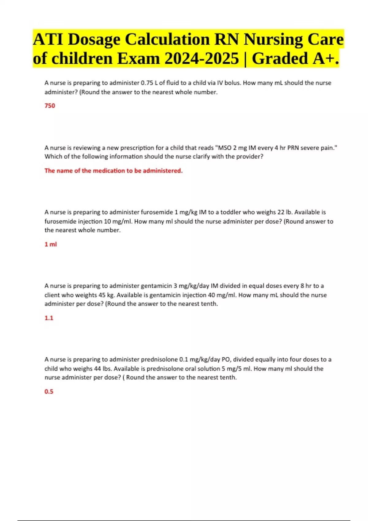 ATI Dosage Calculation RN Nursing Care of children Exam Graded A+. A nurse is reviewing a new prescription for a child that reads "MSO 2 mg IM every 4 hr PRN severe pain." Which of the following information should the nurse clarify with the provider? The name of the medication to be administered. A nurse is preparing to administer furosemide 1 mg/kg IM to a toddler who weighs 22 lb. Available is furosemide injection 10 mg/ml. How many ml should the nurse administer per dose? (Round answer to the nearest whole number. 1 ml A nurse is preparing to administer gentamicin 3 mg/kg/day IM divided in equal doses every 8 hr to a client who weights 45 kg. Available is gentamicin injection 40 mg/ml. How many mL should the nurse administer per dose? (Round the answer to the nearest tenth.