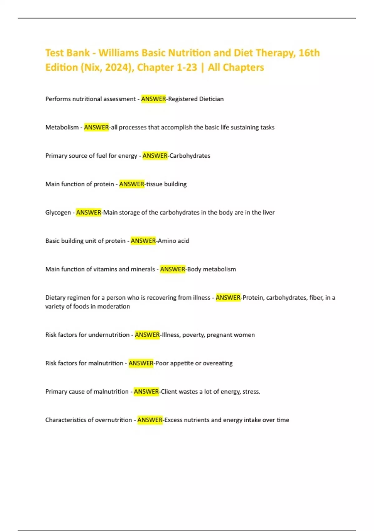 Test Bank - Williams Basic Nutriton and Diet Therapy, 16th Editon (Nix, 2024), Chapter 1-23 | All Chapters
