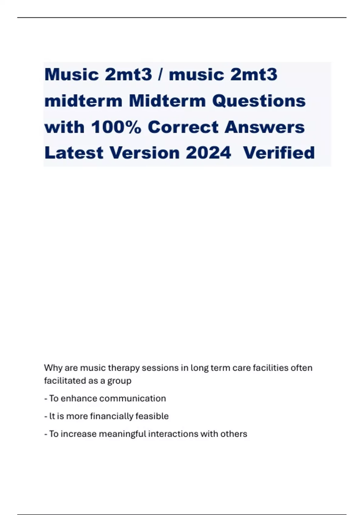 Music 2mt3 / music 2mt3 midterm Midterm Questions with 100% Correct Answers Latest Version 2024 Verified Why are music therapy sessions in long term care facilities often facilitated as a group - To enhance communication - lt is more financially feasible - To increase meaningful interactions with others - All of the above - ✔✔✔ANSWER -all of the above Which of the following example(s) pertain to the Nordoff Robbins Music Therapy Approach? - Music as therapy. - Tapping into the client's innate musical ability. - Facilitating education goals as Clive Robbins was a special education teacher - A & B - ✔✔✔ANSWER -A & B Which approach is based on the concept of replacing irrational thinking? - Eclectic - Psychodynamic - Behavioural - Cognitive Behavioural - ✔✔✔ANSWER -Cognitive Behavioural What are the most typical goals of the MT approach? - to facilitate vitality and manage stress and anxiety - to promote self -expression, improve happiness & quality of life to provide an evidence -based result to provide meaning and coherence in life - to enhance resources in building social networks, developing agency and empowerment - ✔✔✔ANSWER -to enhance resources in building social networks, developing agency and empowerment CMT is influenced by... - Behavioural Theory - System Theory - Biological Theory - Cognitive Theory - ✔✔✔ANSWER -system theory Community music therapy is best defined as people coming together to play music as a group within a community. - True - False - ✔✔✔ANSWER -false In a CMT session, participants are required to perform and give feedback to other participants. - True - False - ✔✔✔ANSWER -false