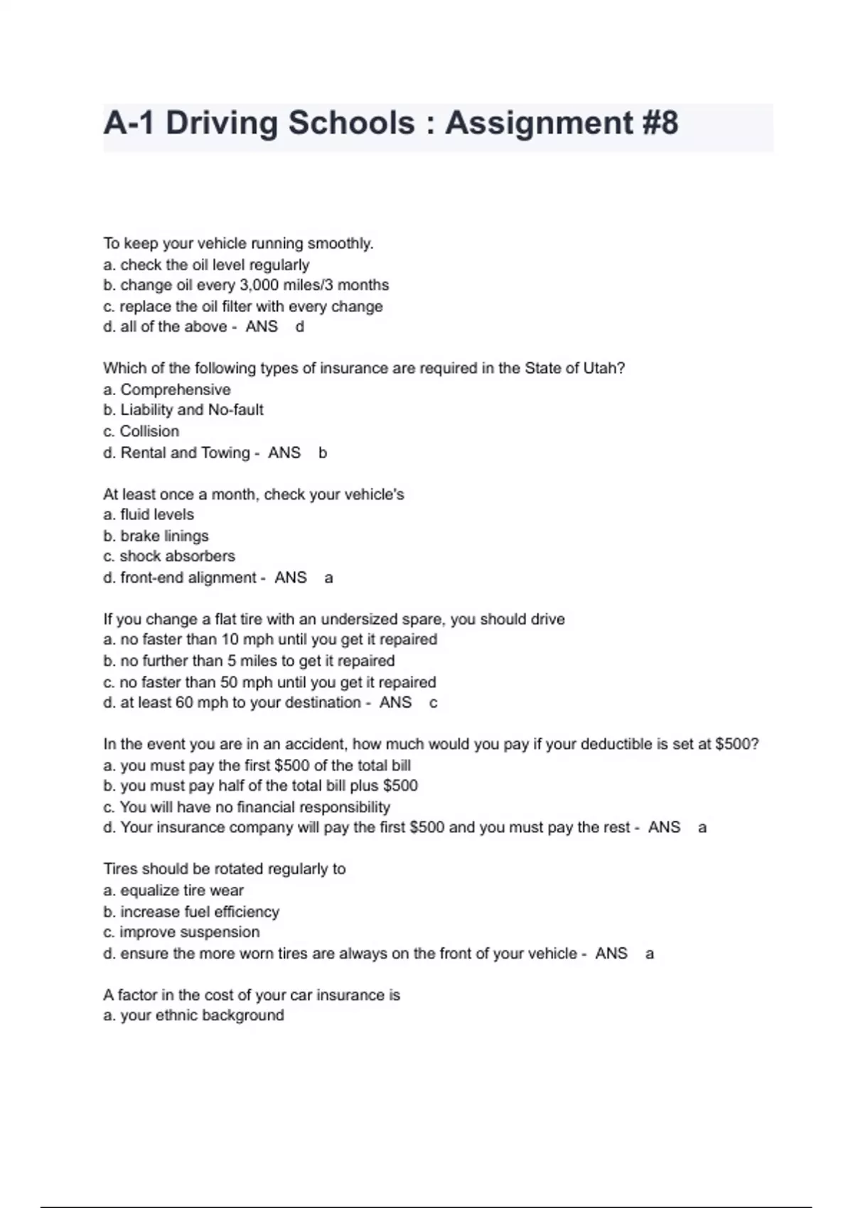 A-1 Driving Schools : Assignment #8 Exam Questions And Answers To keep your vehicle running smoothly. a. check the oil level regularly b. change oil every 3,000 miles/3 months c. replace the oil filter with every change d. all of the above - ANS d Which of the following types of insurance are required in the State of Utah? a. Comprehensive b. Liability and No-fault c. Collision d. Rental and Towing - ANS b At least once a month, check your vehicle's a. fluid levels b. brake linings c. shock absorbers d. front-end alignment - ANS a If you change a flat tire with an undersized spare, you should drive a. no faster than 10 mph until you get it repaired b. no further than 5 miles to get it repaired c. no faster than 50 mph until you get it repaired d. at least 60 mph to your destination - ANS c In the event you are in an accident, how much would you pay if your deductible is set at $500? a. you must pay the first $500 of the total bill b. you must pay half of the total bill plus $500 c. You will have no financial responsibility d. Your insurance company will pay the first $500 and you must pay the rest - ANS a Tires should be rotated regularly to a. equalize tire wear b. increase fuel efficiency c. improve suspension d. ensure the more worn tires are always on the front of your vehicle - ANS a A factor in the cost of your car insurance is a. your ethnic background
