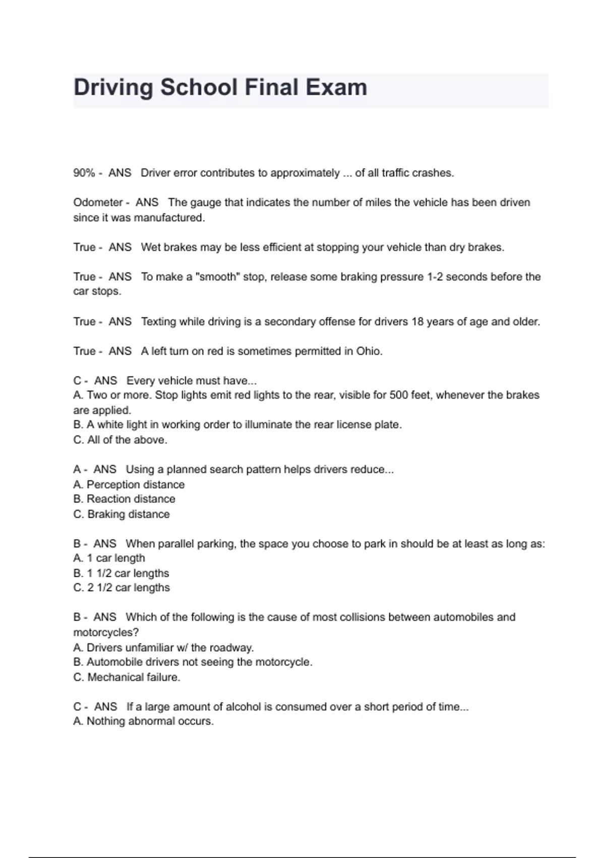 Driving School Final Exam Questions And Answers 90% - ANS Driver error contributes to approximately ... of all traffic crashes. Odometer - ANS The gauge that indicates the number of miles the vehicle has been driven since it was manufactured. True - ANS Wet brakes may be less efficient at stopping your vehicle than dry brakes. True - ANS To make a "smooth" stop, release some braking pressure 1-2 seconds before the car stops. True - ANS Texting while driving is a secondary offense for drivers 18 years of age and older. True - ANS A left turn on red is sometimes permitted in Ohio. C - ANS Every vehicle must have... A. Two or more. Stop lights emit red lights to the rear, visible for 500 feet, whenever the brakes are applied. B. A white light in working order to illuminate the rear license plate. C. All of the above. A - ANS Using a planned search pattern helps drivers reduce... A. Perception distance B. Reaction distance C. Braking distance B - ANS When parallel parking, the space you choose to park in should be at least as long as: A. 1 car length B. 1 1/2 car lengths C. 2 1/2 car lengths