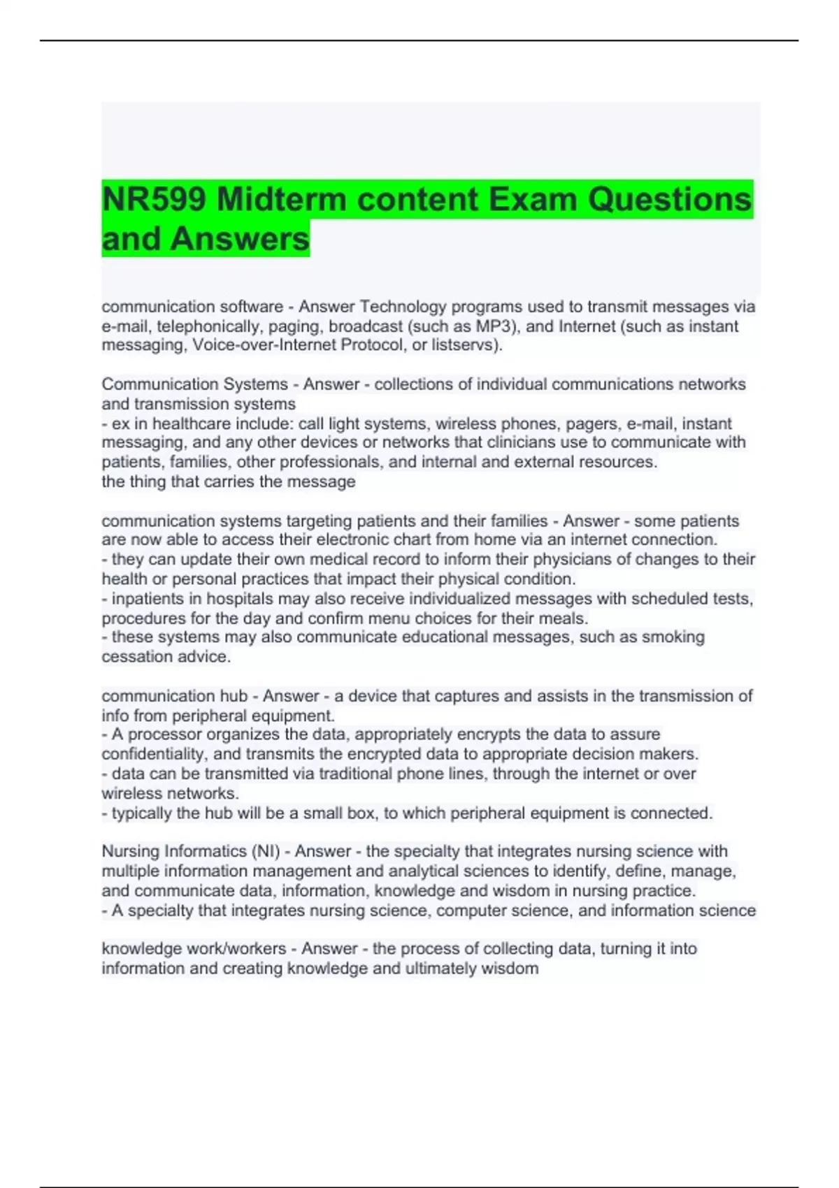 nr599 midterm content exam questions and answers