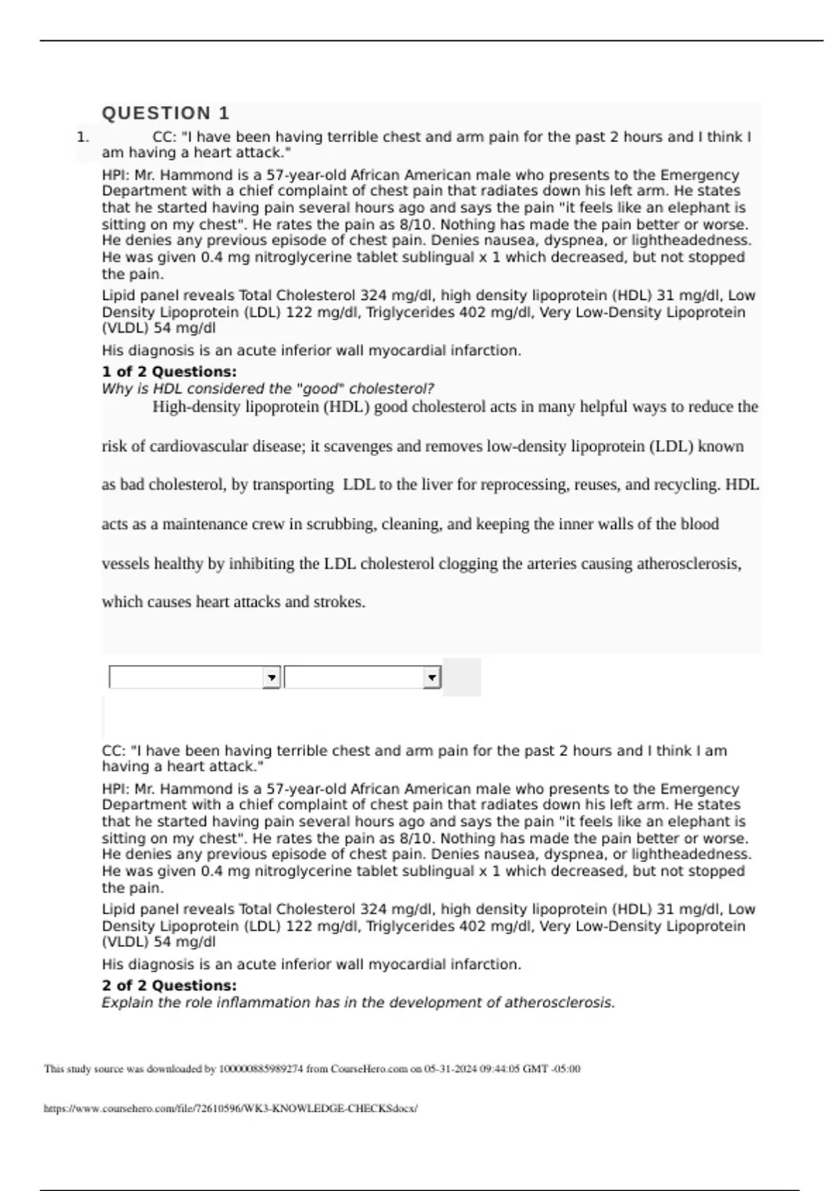 QUESTION 1 1. CC: "I have been having terrible chest and arm pain for the past 2 hours and I think I am having a heart attack." HPI: Mr. Hammond is a 57-year-old African American male who presents to the Emergency Department with a chief complaint of chest pain that radiates down his left arm. He states that he started having pain several hours ago and says the pain "it feels like an elephant is sitting on my chest". He rates the pain as 8/10. Nothing has made the pain better or worse. He denies any previous episode of chest pain. Denies nausea, dyspnea, or lightheadedness. He was given 0.4 mg nitroglycerine tablet sublingual x 1 which decreased, but not stopped the pain. Lipid panel reveals Total Cholesterol 324 mg/dl, high density lipoprotein (HDL) 31 mg/dl, Low Density Lipoprotein (LDL) 122 mg/dl, Triglycerides 402 mg/dl, Very Low-Density Lipoprotein (VLDL) 54 mg/dl His diagnosis is an acute inferior wall myocardial infarction. 1 of 2 Questions: Why is HDL considered the "good" cholesterol? High-density lipoprotein (HDL) good cholesterol acts in many helpful ways to reduce the risk of cardiovascular disease; it scavenges and removes low-density lipoprotein (LDL) known as bad cholesterol, by transporting LDL to the liver for reprocessing, reuses, and recycling. HDL acts as a maintenance crew in scrubbing, cleaning, and keeping the inner walls of the blood vessels healthy by inhibiting the LDL cholesterol clogging the arteries causing athero
