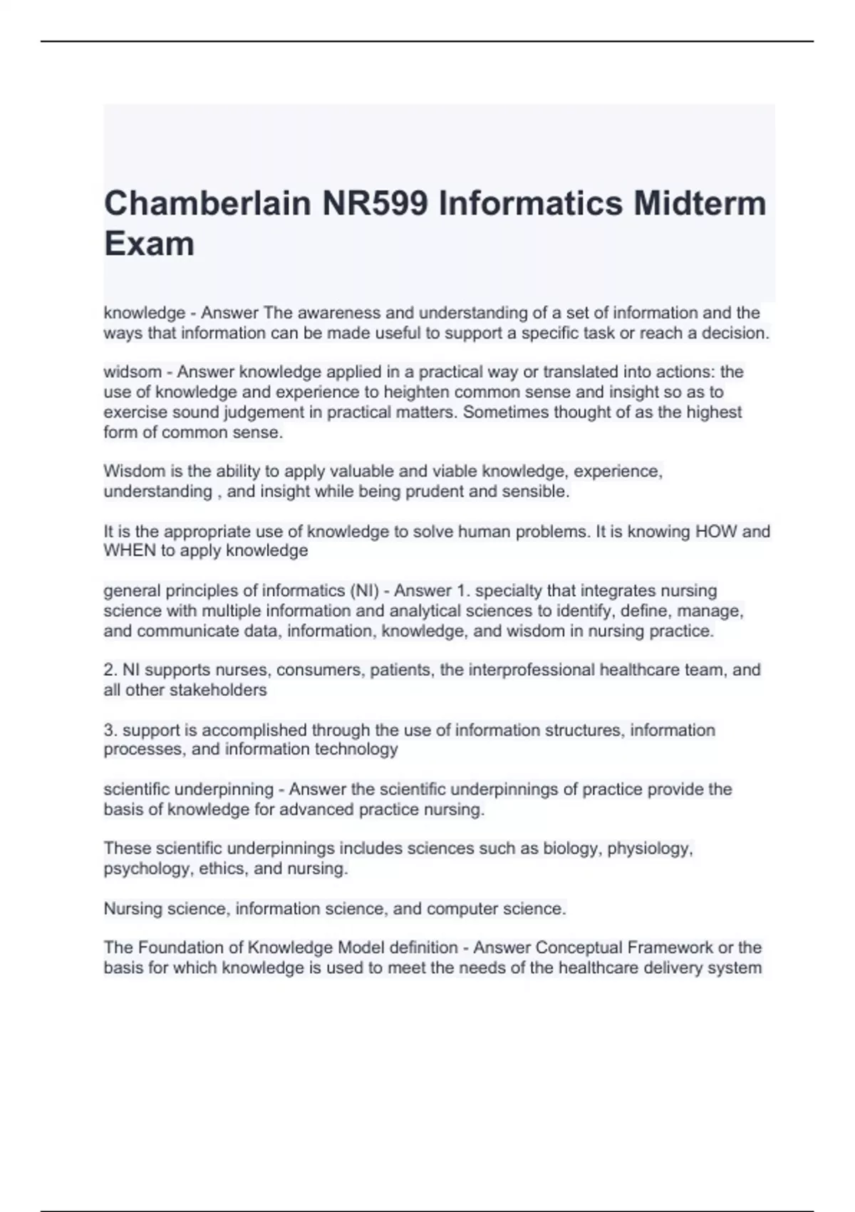 Chamberlain NR599 Informatics Midterm Exam with correct Answers