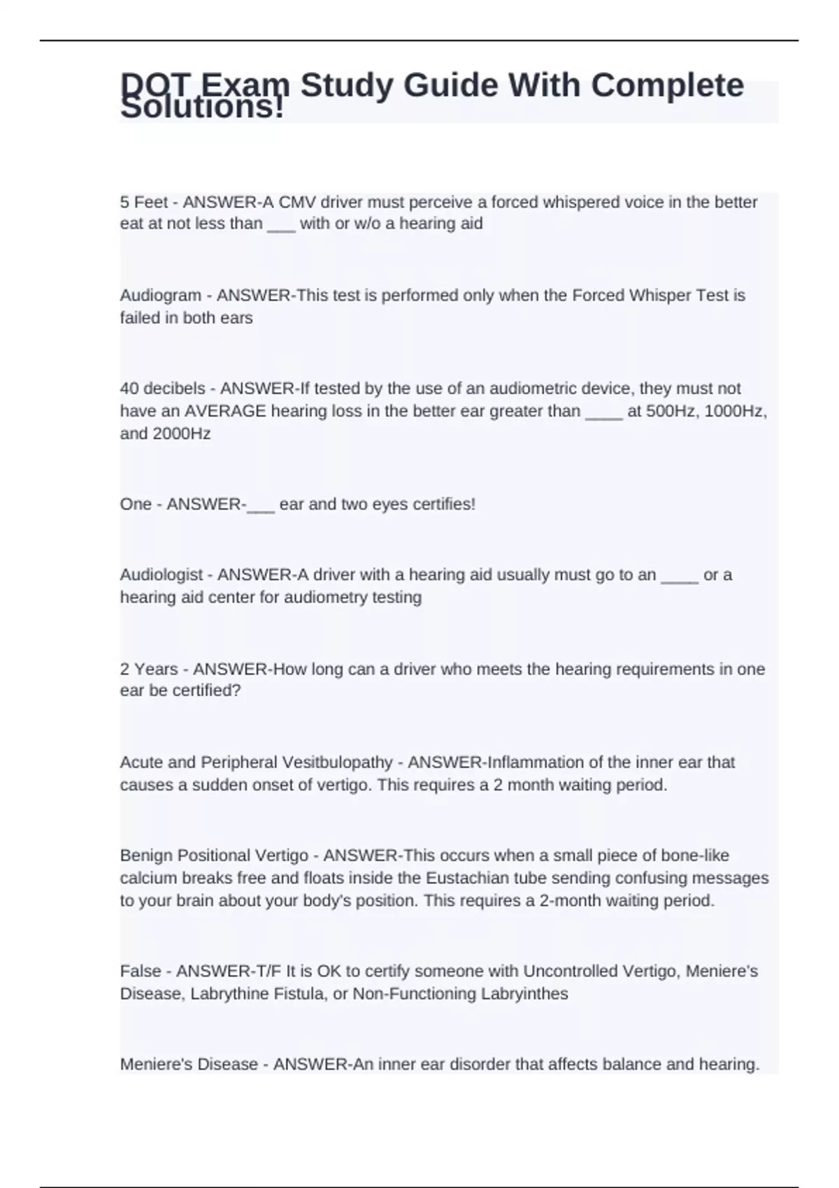 5 Feet - ANSWER-A CMV driver must perceive a forced whispered voice in the better eat at not less than ___ with or w/o a hearing aid Audiogram - ANSWER-This test is performed only when the Forced Whisper Test is failed in both ears 40 decibels - ANSWER-If tested by the use of an audiometric device, they must not have an AVERAGE hearing loss in the better ear greater than ____ at 500Hz, 1000Hz, and 2000Hz One - ANSWER-___ ear and two eyes certifies! Audiologist - ANSWER-A driver with a hearing aid usually must go to an ____ or a hearing aid center for audiometry testing 2 Years - ANSWER-How long can a driver who meets the hearing requirements in one ear be certified? Acute and Peripheral Vesitbulopathy - ANSWER-Inflammation of the inner ear that causes a sudden onset of vertigo. This requires a 2 month waiting period. Benign Positional Vertigo - ANSWER-This occurs when a small piece of bone-like calcium breaks free and floats inside the Eustachian tube sending confusing messages to your brain about your body's position. This requires a 2-month waiting period. False - ANSWER-T/F It is OK to certify someone with Uncontrolled Vertigo, Meniere's Disease, Labrythine Fistula, or Non-Functioning Labryinthes Meniere's Disease - ANSWER-An inner ear disorder that affects balance and hearing. Labrythine Fistula - ANSWER-An abnormal opening in the bony capsule of the inner ear resulting in the leakage of the peri lymph from the semicircular canals of the middle ear. Non-Functioning Labryinths - ANSWER-Loss of vestibular function in both Labryinths leading to characteristic dysfunction in vision and balance. These symptoms reflect how crucial our Labryinth sense is for generating proper reflexes so that we can see clearly when we are moving and not lose our balance when we are standing or walking. Inner Ear - ANSWER-Another name for the Labryinth Elevated Blood Pressure - ANSWER-1 or 2 readings greater than or equal to 140/90 on the same day Hypertension - ANSWER-Two readings greater than or equal to 140/90 on consecutive exams on two different days