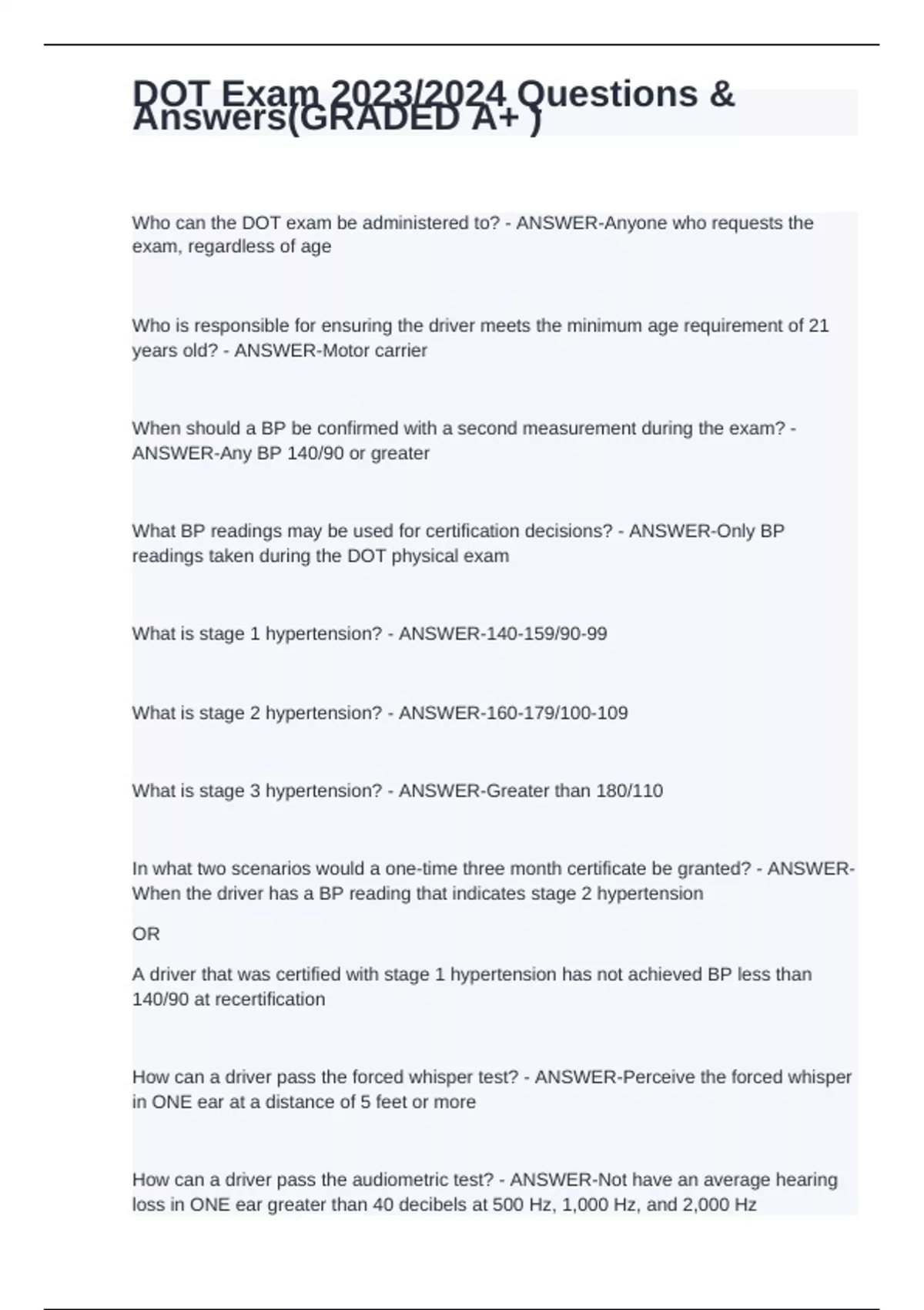 Who can the DOT exam be administered to? - ANSWER-Anyone who requests the exam, regardless of age Who is responsible for ensuring the driver meets the minimum age requirement of 21 years old? - ANSWER-Motor carrier When should a BP be confirmed with a second measurement during the exam? - ANSWER-Any BP 140/90 or greater What BP readings may be used for certification decisions? - ANSWER-Only BP readings taken during the DOT physical exam What is stage 1 hypertension? - ANSWER-140-159/90-99 What is stage 2 hypertension? - ANSWER-160-179/100-109 What is stage 3 hypertension? - ANSWER-Greater than 180/110 In what two scenarios would a one-time three month certificate be granted? - ANSWER-When the driver has a BP reading that indicates stage 2 hypertension OR A driver that was certified with stage 1 hypertension has not achieved BP less than 140/90 at recertification How can a driver pass the forced whisper test? - ANSWER-Perceive the forced whisper in ONE ear at a distance of 5 feet or more How can a driver pass the audiometric test? - ANSWER-Not have an average hearing loss in ONE ear greater than 40 decibels at 500 Hz, 1,000 Hz, and 2,000 Hz When should both hearing tests be administered to a driver? - ANSWER-When the driver fails the initial hearing test How can a driver's hearing be tested for certification? - ANSWER-By administering either the forced whisper or audiometric test When should medical examiner need to complete an online MCSA-5850 form? - ANSWER-When an exam is performed on a driver - Must submit by midnight of the next calendar day AND Must report if no exams are performed during a calendar month Who should the medical examiner's certificate be given to? - ANSWER-The original is given to the driver A copy may be given to the employer upon request How long must a medical examiner retain driver medical records for? - ANSWER-3 years Can work restrictions be given as part of certification? - ANSWER-No What should be done when a driver returns after being given a 3 month certificate that is nearing expiration? - ANSWER-Perform an entirely new DOT exam