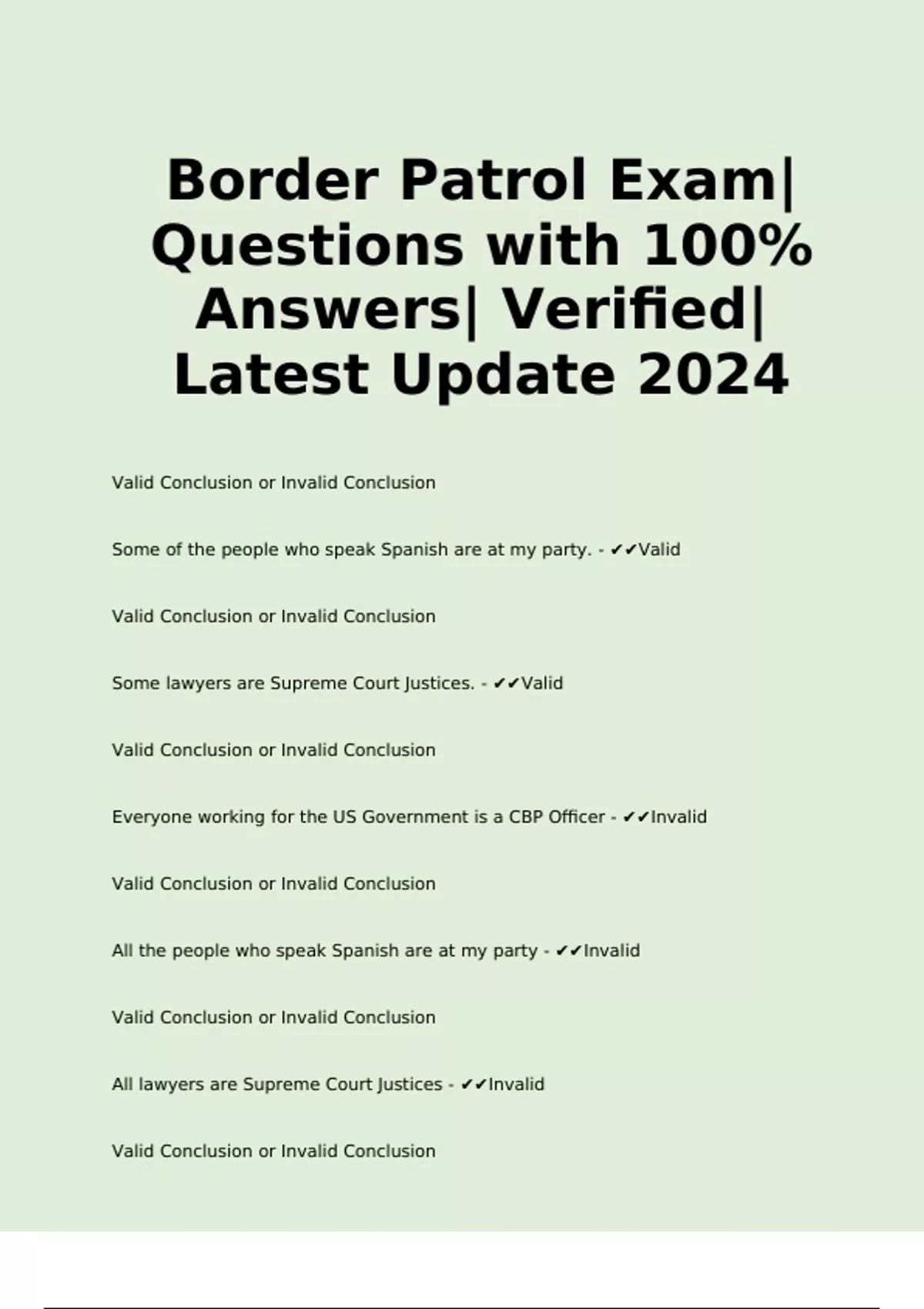 Border Patrol Exam| Questions with 100% Answers| Verified| Latest Update 2024 Valid Conclusion or Invalid Conclusion Some of the people who speak Spanish are at my party. - Valid