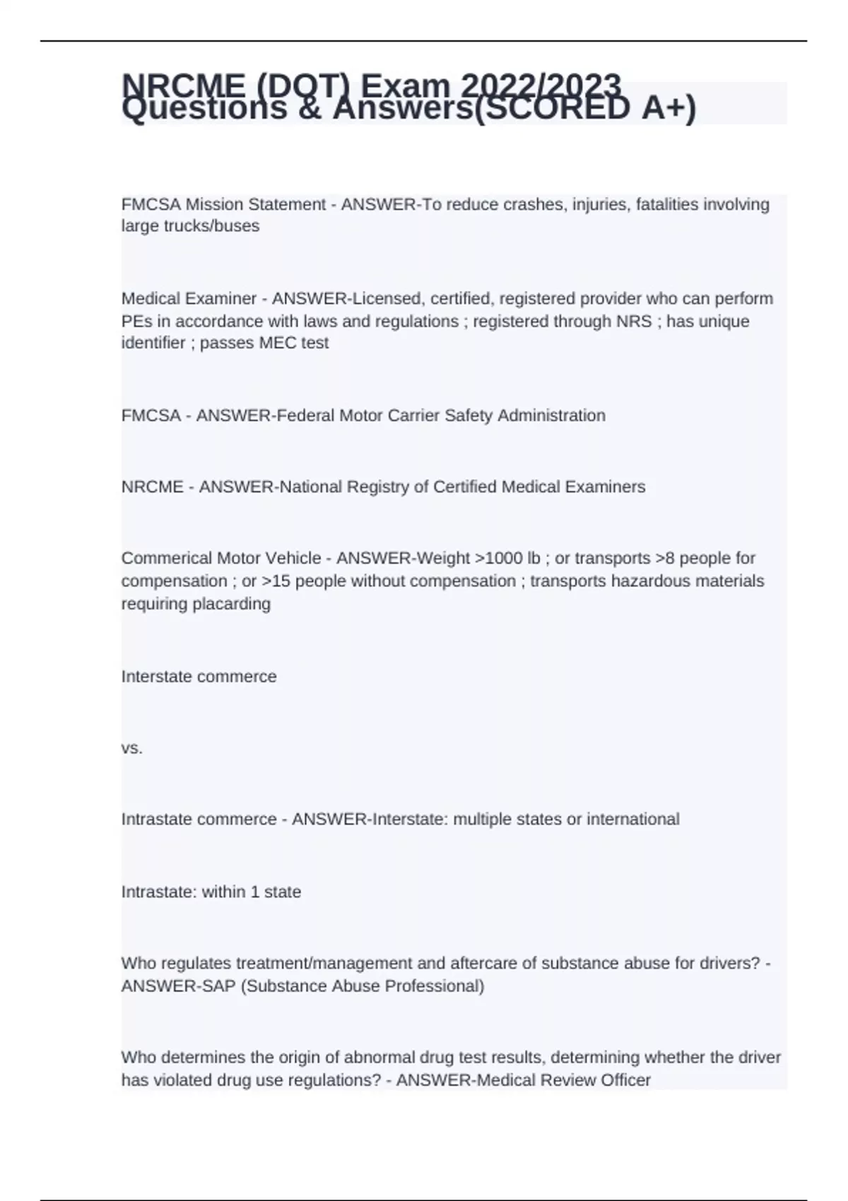 FMCSA Mission Statement - ANSWER-To reduce crashes, injuries, fatalities involving large trucks/buses Medical Examiner - ANSWER-Licensed, certified, registered provider who can perform PEs in accordance with laws and regulations ; registered through NRS ; has unique identifier ; passes MEC test FMCSA - ANSWER-Federal Motor Carrier Safety Administration NRCME - ANSWER-National Registry of Certified Medical Examiners Commerical Motor Vehicle - ANSWER-Weight >1000 lb ; or transports >8 people for compensation ; or >15 people without compensation ; transports hazardous materials requiring placarding Interstate commerce vs. Intrastate commerce - ANSWER-Interstate: multiple states or international Intrastate: within 1 state Who regulates treatment/management and aftercare of substance abuse for drivers? - ANSWER-SAP (Substance Abuse Professional) Who determines the origin of abnormal drug test results, determining whether the driver has violated drug use regulations? - ANSWER-Medical Review Officer Title 49 CFR 391.41 - ANSWER-Medical Examiner Report Form - Paperwork completed during DOT physical - Physical exam requirements for driver - Determines if Certificate is granted Title 49 CFR 391.43 - ANSWER-Describes responsibilities of Medical Examiner, instructions for exam, and requirements for medical certification - Supporting information to explain 391.41 When was DOT established? - ANSWER-1966 Became separate entity on Jan 1, 2000 Motor Carrier Safety Improvement Act of 1999 - ANSWER-Established DOT as separate federal entity Omnibus Transportation Employee Testing Act of 1991 - ANSWER-Required drug testing for drivers The driver must always keep a copy of ____________________ with them while driving - ANSWER-Medical Certificate SPE if applicable Does the driver need to sign a medical release before you release their Medical Certification? - ANSWER-No. Certificate is provided to employer.