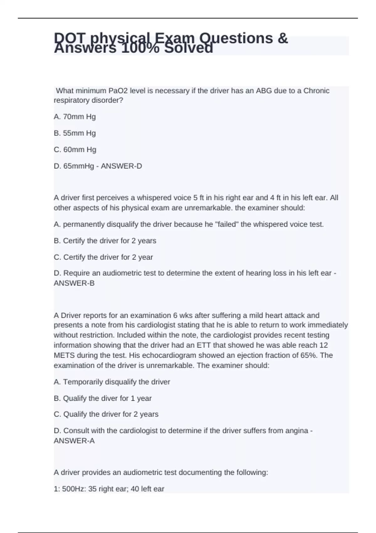 What minimum PaO2 level is necessary if the driver has an ABG due to a Chronic respiratory disorder? A. 70mm Hg B. 55mm Hg C. 60mm Hg D. 65mmHg - ANSWER-D A driver first perceives a whispered voice 5 ft in his right ear and 4 ft in his left ear. All other aspects of his physical exam are unremarkable. the examiner should: A. permanently disqualify the driver because he "failed" the whispered voice test. B. Certify the driver for 2 years C. Certify the driver for 2 year D. Require an audiometric test to determine the extent of hearing loss in his left ear - ANSWER-B A Driver reports for an examination 6 wks after suffering a mild heart attack and presents a note from his cardiologist stating that he is able to return to work immediately without restriction. Included within the note, the cardiologist provides recent testing information showing that the driver had an ETT that showed he was able reach 12 METS during the test. His echocardiogram showed an ejection fraction of 65%. The examination of the driver is unremarkable. The examiner should: A. Temporarily disqualify the driver B. Qualify the diver for 1 year C. Qualify the driver for 2 years D. Consult with the cardiologist to determine if the driver suffers from angina - ANSWER-A A driver provides an audiometric test documenting the following: 1: 500Hz: 35 right ear; 40 left ear 2. 1000hz: 40 R; 45 L 3. 2000Hz: 40 R; 45 L 4. 4000hz: 50 R; 50 L The medical examiner should: A. Disqualify the driver because he does not meet minimum hearing requirements to drive B. Certify the driver for 2 years C. Certify the driver for 1 year D. Require the driver to obtain a hearing exemption - ANSWER-B During the examination of a commercial driver, the examiner notices that the driver's peripheral vision is 70 degrees to the left and 80 degrees to the right. the examiner should: A. Disqualify the driver B. Require the driver to obtain a vison exemption because of the limitation in the driver's left peripheral field C. Qualify the driver for 2 years D. Have the driver consult with an ophthalmologist to determine if the driver's peripheral vison meets minimum standards - ANSWER-C During examination, the medical examiner notices that the driver is distant, lacks eye contact and shows absolutely no emotional response during the exam. the examiner's best response should be: A. Provider the driver with a "CAGE" questionnaire to determine if he suffers from alcoholism B. Disqualify the driver and refer him to a mental health professional prior to consideration for certification C. Certify the driver with a 1-time, 3-month certificate to determine if there is any effect on the driver's ability to drive a CMV D. Require a skill performance evaluation to ascertain if the driver has any limitations with driving - ANSWER-B A driver admits to the use of marijuana for the treatm