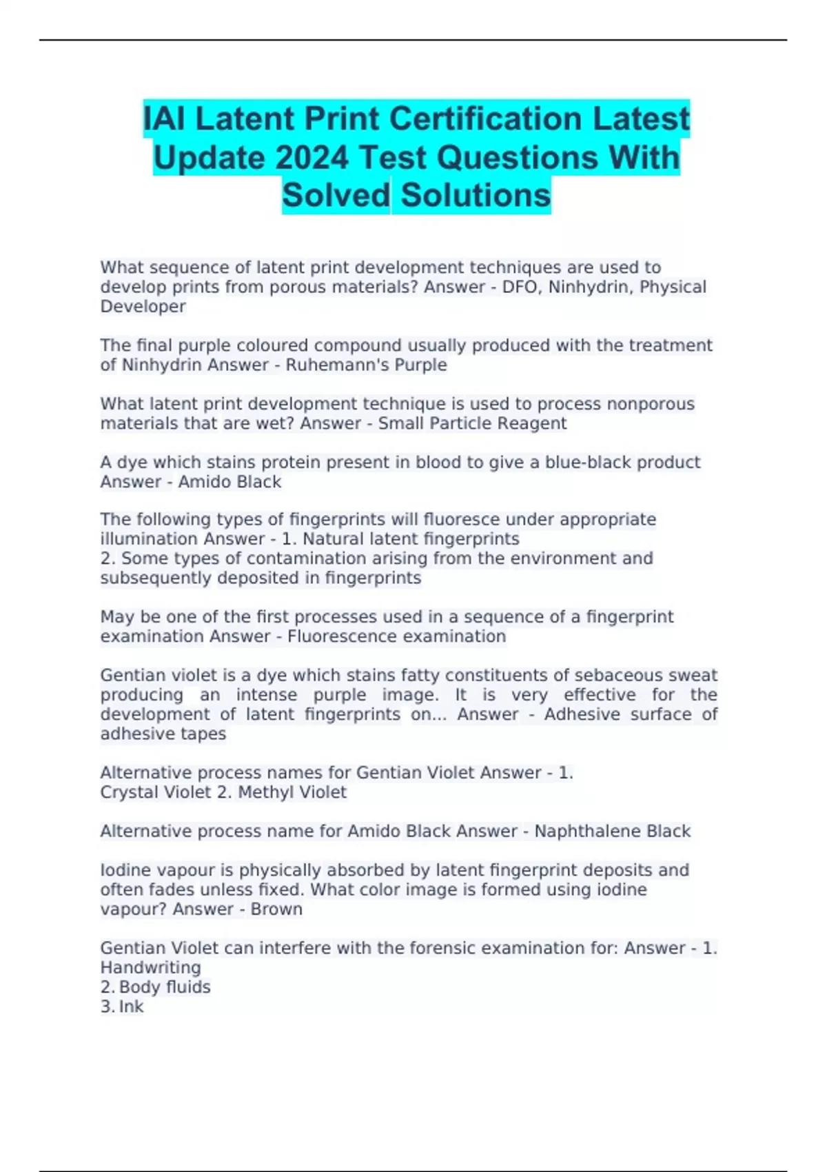 IAI Latent Print Certification Latest Update 2024 Test Questions With Solved Solutions