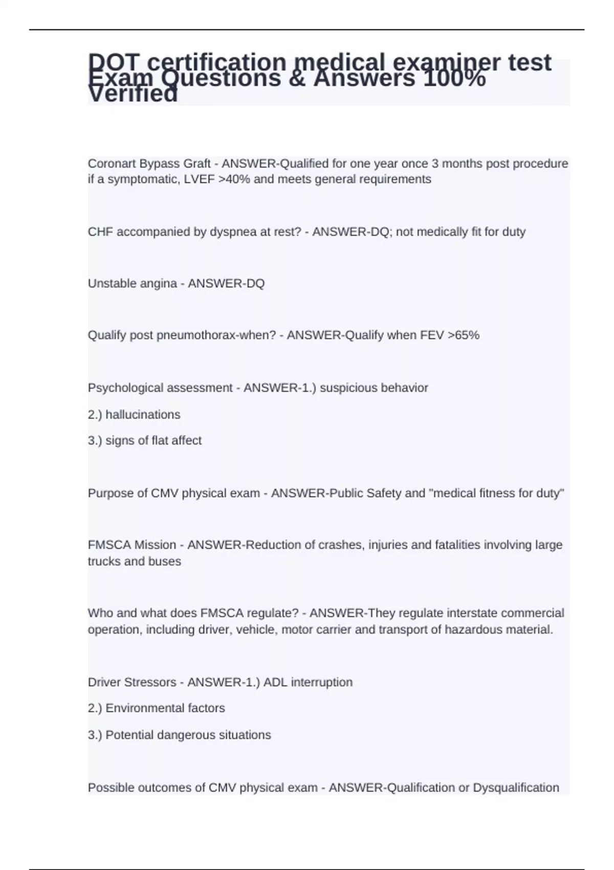 Coronart Bypass Graft - ANSWER-Qualified for one year once 3 months post procedure if a symptomatic, LVEF >40% and meets general requirements CHF accompanied by dyspnea at rest? - ANSWER-DQ; not medically fit for duty Unstable angina - ANSWER-DQ Qualify post pneumothorax-when? - ANSWER-Qualify when FEV >65% Psychological assessment - ANSWER-1.) suspicious behavior 2.) hallucinations 3.) signs of flat affect Purpose of CMV physical exam - ANSWER-Public Safety and "medical fitness for duty" FMSCA Mission - ANSWER-Reduction of crashes, injuries and fatalities involving large trucks and buses Who and what does FMSCA regulate? - ANSWER-They regulate interstate commercial operation, including driver, vehicle, motor carrier and transport of hazardous material. Driver Stressors - ANSWER-1.) ADL interruption 2.) Environmental factors 3.) Potential dangerous situations Possible outcomes of CMV physical exam - ANSWER-Qualification or Dysqualification Who can perform vision portion of exam - ANSWER-CMV Medical examiner, MA, opthalmologist/optometrist Visual acuity requirements - ANSWER-20/40 unilateral and bilateral Which 5 eye conditions must be asked about and then referred to eye specialist? - ANSWER-1.) glaucoma 2.) retinopathy 3.) aphakia 4.) macular degeneration 5.) cataracts Whisper test must be performed at - ANSWER-5 feet Time post MI prior to driving - ANSWER-2 months and meets all other PE requirements Minimum LVEF - ANSWER-40%