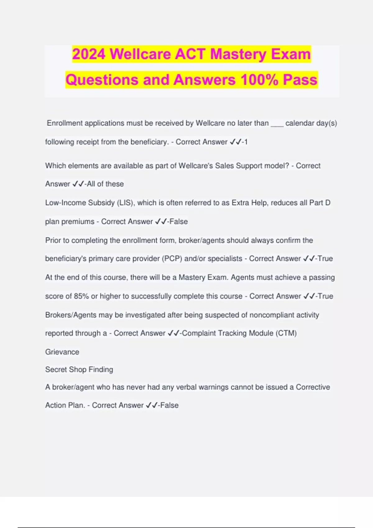 2024 Wellcare ACT Mastery Exam Questions and Answers 100% Pass Enrollment applications must be received by Wellcare no later than ___ calendar day(s) following receipt from the beneficiary. - Correct Answer ️️ -1 Which elements are available as part of Wellcare's Sales Support model? - Correct Answer ️️ -All of these Low-Income Subsidy (LIS), which is often referred to as Extra Help, reduces all Part D plan premiums - Correct Answer ️️ -False Prior to completing the enrollment form, broker/agents should always confirm the beneficiary's primary care provider (PCP) and/or specialists - Correct Answer ️️ -True At the end of this course, there will be a Mastery Exam. Agents must achieve a passing score of 85% or higher to successfully complete this course - Correct Answer ️️ -True Brokers/Agents may be investigated after being suspected of noncompliant activity reported through a - Correct Answer ️️ -Complaint Tracking Module (CTM) Grievance Secret Shop Finding A broker/agent who has never had any verbal warnings cannot be issued a Corrective Action Plan. - Correct Answer ️️ -False Wellcare does not need to be informed of all marketing/sales events at which plans or materials will be presented or distributed (formaland informal). - Correct Answer ️️ - False Marketing benefits in a service area where those benefits are not available is prohibited and considered misleading unless that is unavoidable because of local/regional or media use. - Correct Answer ️️ -True CustomPoint sales material order dates will be posted on W - Correct Answer ️️ -False The online Centene Workbench self-service portal enables you to - Correct Answer ️️ - All of these The TPMO disclaimer must be used by any TPMO that sells plans on behalf of more than one MA plan provider. The disclaimer must be: - Correct Answer ️️ -Included in any marketing materials, including print materials and television advertisements developed, used, or distributed by the TPMO. Verbally conveyed within the first minute of a sales call. Prominently displayed on TPMO websites (regardless of content). Electronically conveyed when communicating with a beneficiary through email, online chat, or other electronic means of communication (regardless of content). Brokers/Agents can access the following resources under the Shared Resources section in Centene Workbench. - Correct Answer ️️ -All of these Which of the following is not an example of Protected Health Information (PHI)? - Correct Answer ️️ -Library Card When a paper SOA form is used, it must be completed __________ hosting the sales presentation. - Correct Answer ️️ -48 Hours prior to Ascend is a fast, easy, and compliant way for brokers/agents to submit agent-assisted electronic enrollments. - Correct Answer ️️ -True When explaining the provider network for D-SNPs and C-SNPs: - Correct Answer ️️ - Avoid submitting applications with no primary care provider (PCP) to assist these higher-risk members. If a member is not connected to a primary care provider (PCP), we should always encourage and assist with connecting them with an in-network doctor If a requested effective date is available for the special election period being selected, ensure you are requesting a date within the correct time frame for the memb