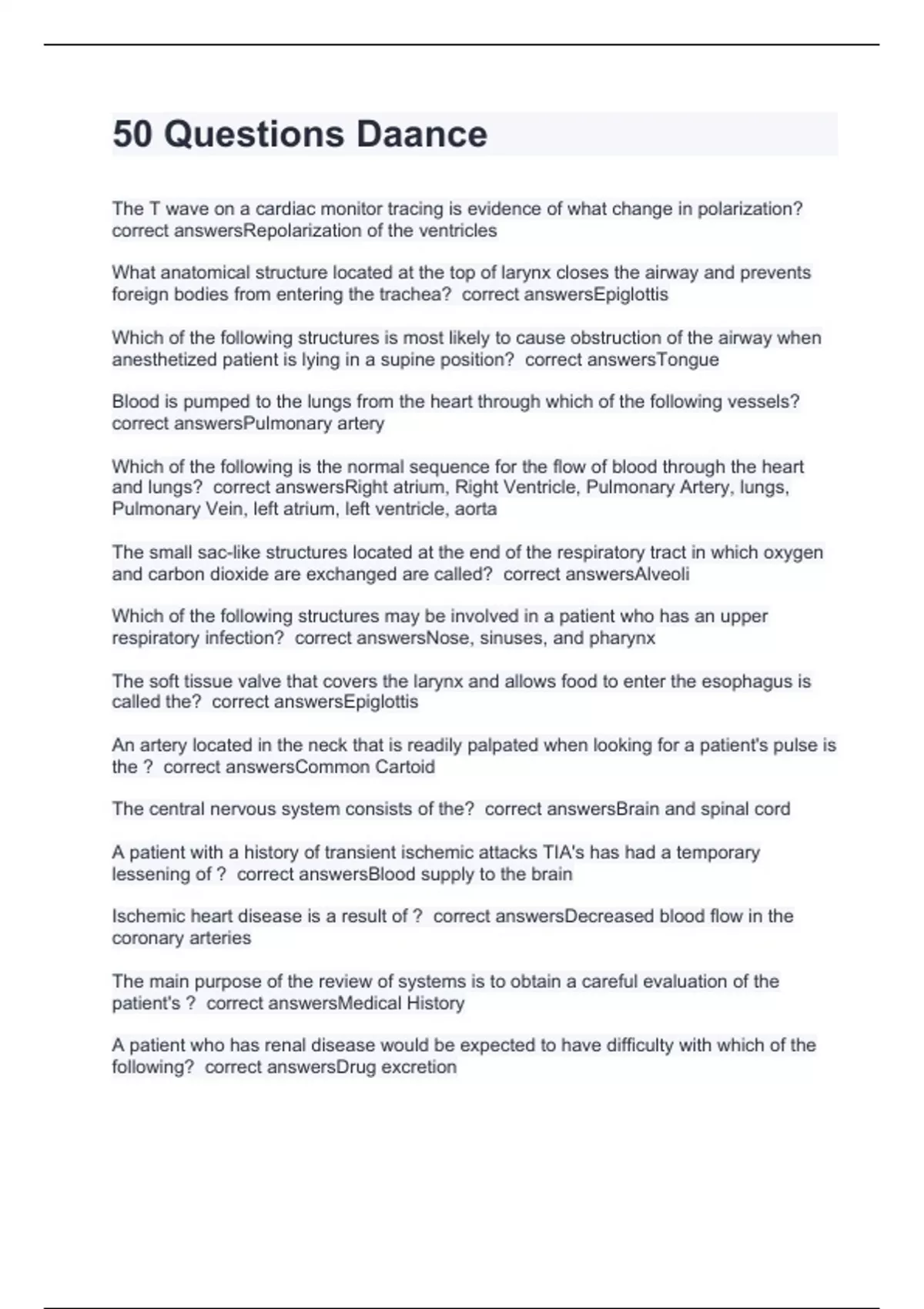 The T wave on a cardiac monitor tracing is evidence of what change in polarization? correct answersRepolarization of the ventricles What anatomical structure located at the top of larynx closes the airway and prevents foreign bodies from entering the trachea? correct answersEpiglottis Which of the following structures is most likely to cause obstruction of the airway when anesthetized patient is lying in a supine position? correct answersTongue Blood is pumped to the lungs from the heart through which of the following vessels? correct answersPulmonary artery Which of the following is the normal sequence for the flow of blood through the heart and lungs? correct answersRight atrium, Right Ventricle, Pulmonary Artery, lungs, Pulmonary Vein, left atrium, left ventricle, aorta The small sac-like structures located at the end of the respiratory tract in which oxygen and carbon dioxide are exchanged are called? correct answersAlveoli Which of the following structures may be involved in a patient who has an upper respiratory infection? correct answersNose, sinuses, and pharynx The soft tissue valve that covers the larynx and allows food to enter the esophagus is called the? correct answersEpiglottis An artery located in the neck that is readily palpated when looking for a patient's pulse is the ? correct answersCommon Cartoid The central nervous system consists of the? correct answersBrain and spinal cord A patient with a history of transient ischemic attacks TIA's has had a temporary lessening of ? correct answersBlood supply to the brain Ischemic heart disease is a result of ? correct answersDecreased blood flow in the coronary arteries The main purpose of the review of systems is to obtain a careful evaluation of the patient's ? correct answersMedical History A patient who has renal disease would be expected to have difficulty with which of the following? correct answersDrug excretion