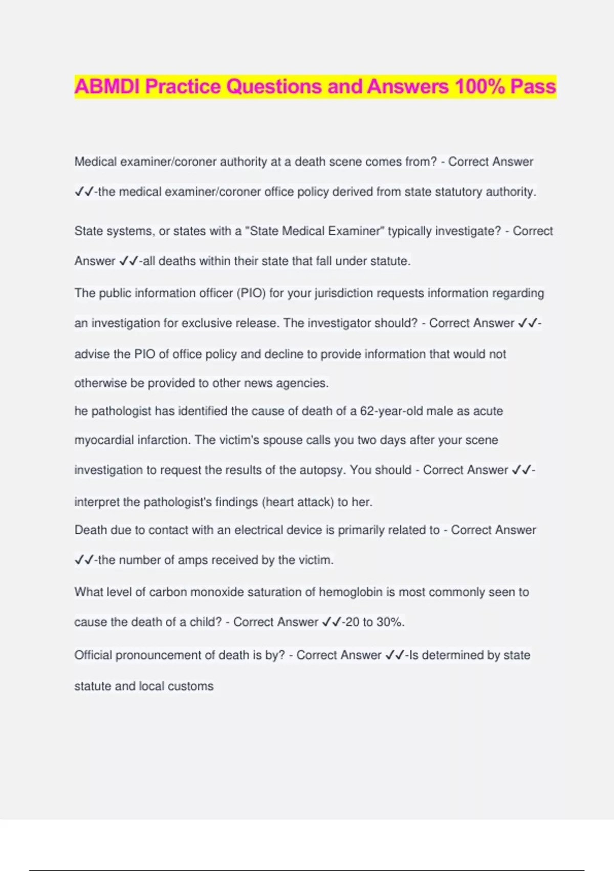 ABMDI Practice Questions and Answers 100% Pass Medical examiner/coroner authority at a death scene comes from? - Correct Answer ️️ -the medical examiner/coroner office policy derived from state statutory authority. State systems, or states with a "State Medical Examiner" typically investigate? - Correct Answer ️️ -all deaths within their state that fall under statute. The public information officer (PIO) for your jurisdiction requests information regarding an investigation for exclusive release. The investigator should? - Correct Answer ️️ - advise the PIO of office policy and decline to provide information that would not otherwise be provided to other news agencies. he pathologist has identified the cause of death of a 62-year-old male as acute myocardial infarction. The victim's spouse calls you two days after your scene investigation to request the results of the autopsy. You should - Correct Answer ️️ - interpret the pathologist's findings (heart attack) to her. Death due to contact with an electrical device is primarily related to - Correct Answer ️️ -the number of amps received by the victim. What level of carbon monoxide saturation of hemoglobin is most commonly seen to cause the death of a child? - Correct Answer ️️ -20 to 30%. Official pronouncement of death is by? - Correct Answer ️️ -Is determined by state statute and local customs