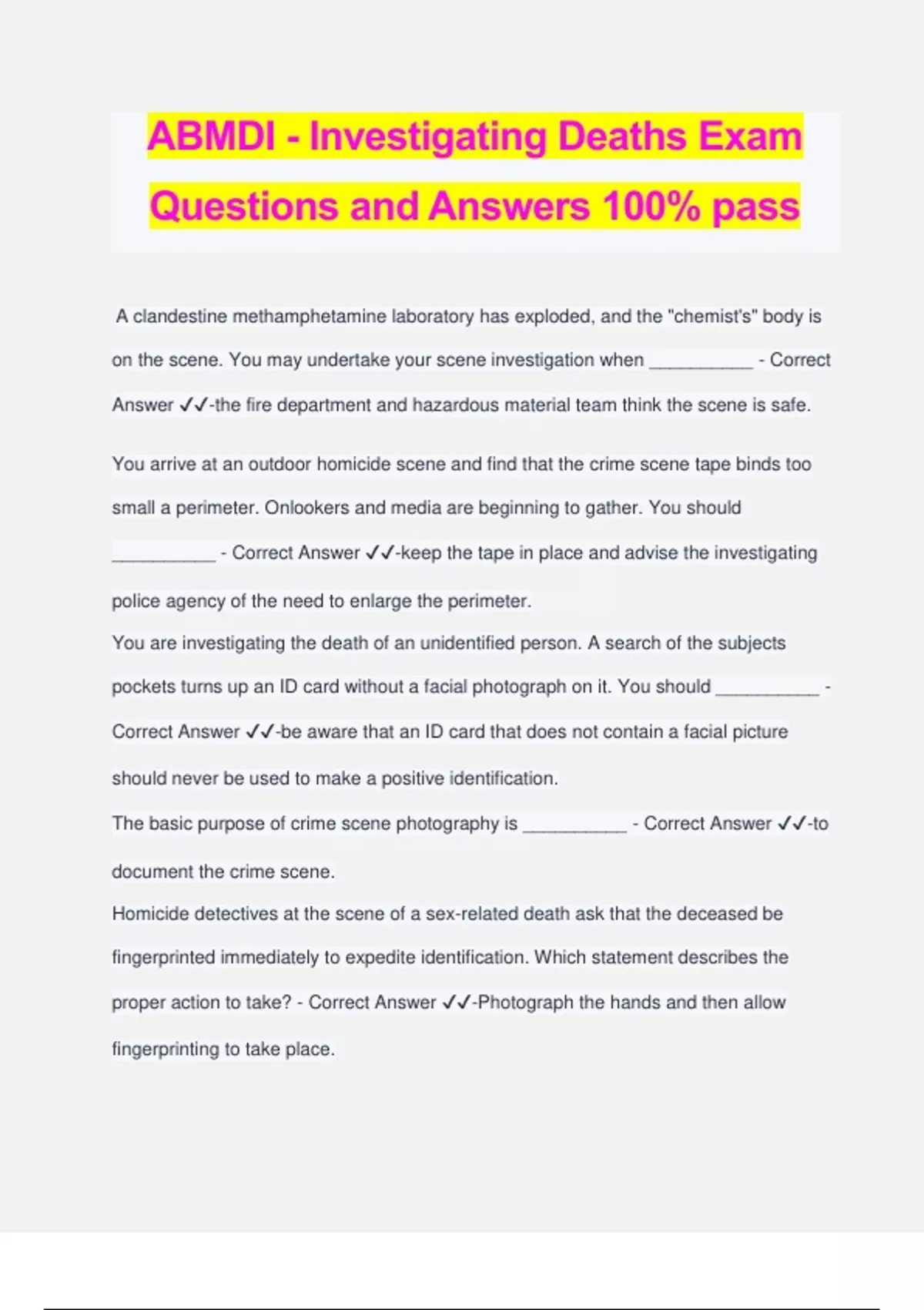 ABMDI - Investigating Deaths Exam Questions and Answers 100% pass A clandestine methamphetamine laboratory has exploded, and the "chemist's" body is on the scene. You may undertake your scene investigation when __________ - Correct Answer ️️ -the fire department and hazardous material team think the scene is safe. You arrive at an outdoor homicide scene and find that the crime scene tape binds too small a perimeter. Onlookers and media are beginning to gather. You should __________ - Correct Answer ️️ -keep the tape in place and advise the investigating police agency of the need to enlarge the perimeter. You are investigating the death of an unidentified person. A search of the subjects pockets turns up an ID card without a facial photograph on it. You should __________ - Correct Answer ️️ -be aware that an ID card that does not contain a facial picture should never be used to make a positive identification. The basic purpose of crime scene photography is __________ - Correct Answer ️️ -to document the crime scene. Homicide detectives at the scene of a sex-related death ask that the dece