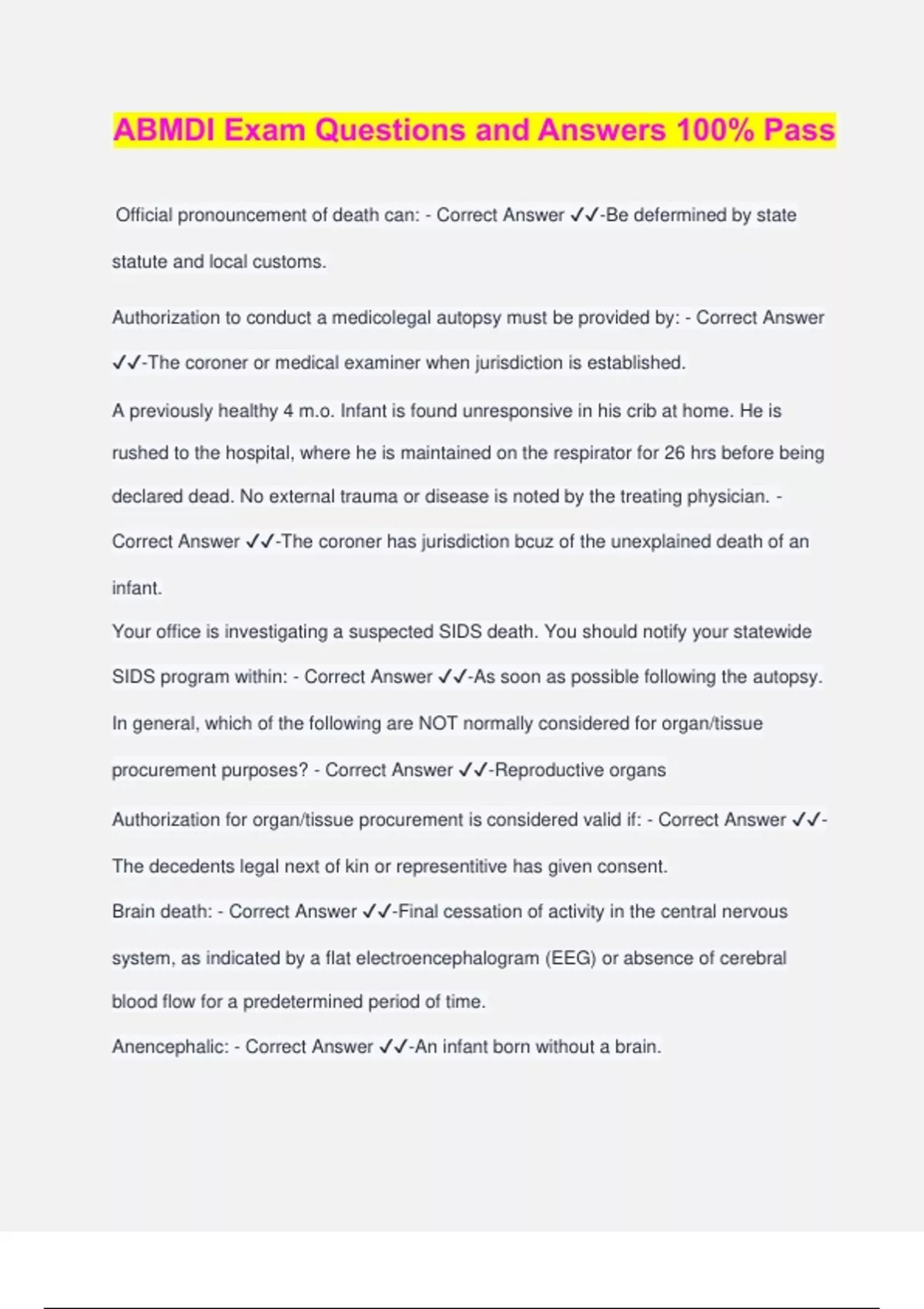 ABMDI Exam Questions and Answers 100% Pass Official pronouncement of death can: - Correct Answer ️️ -Be defermined by state statute and local customs. Authorization to conduct a medicolegal autopsy must be provided by: - Correct Answer ️️ -The coroner or medical examiner when jurisdiction is established. A previously healthy 4 m.o. Infant is found unresponsive in his crib at home. He is rushed to the hospital, where he is maintained on the respirator for 26 hrs before being declared dead. No external trauma or disease is noted by the treating physician. - Correct Answer ️️ -The coroner has jurisdiction bcuz of the unexplained death of an infant. Your office is investigating a suspected SIDS death. You should notify your statewide SIDS program within: - Correct Answer ️️ -As soon as possible following the autopsy. In general, which of the following are NOT normally considered for organ/tissue procurement purposes? - Correct Answer ️️ -Reproductive organs Authorization for organ/tissue procurement is considered valid if: - Correct Answer ️️ - The decedents legal next of kin or representitive has given consent. Brain death: - Correct Answer ️️ -Final cessation of activity in the central nervous system, as indicated by a flat electroencephalogram (EEG) or absence of cerebral blood flow for a predetermined period of time. Anencephalic: - Correct Answer ️️ -An infant born without a brain. Jurisdiction: - Correct Answer ️️ -The power or authority a court or office has over individuals or trauma. The death investigator and a police investigator arrive at the scene within minutes of each other: - Correct Answer ️️ -The best approach is a "team" approach to performing the work. In constructing a narrative report, the main idea is to relate: - Correct Answer ️️ -An overall and concise view of what happened. Choose one of the most important important communication skills for gathering information at the scene: - Correct Answer ️️ -Listen and actively study witnesses. The pathologist must be altered to religious requests from the family: - Correct Answer ️️ -Before the autopsy is performed. When communicating with the pathologist, a good investigator distinguishes between a request for information and a request for an opinion. Which type is this, " what time was the death pronounced?" - Correct Answer ️️ -Request for information. Common law marriage: - Correct Answer ️️ -Marriage that is recognized because the couple have been cohabiting for a determined length of time, but there has been no legal ceremony. Disinterment - Correct Answer ️️ -The opening of a grave and removal of the body for the purpose of reexamination or removal to another site. Euphemism - Correct Answer ️️ -A mild or inoffensive term or phrase that is substituted for another, more explicit term. Objective report: - Correct Answer ️️ -A report made in an independent and unbiased manner, without regard for personal attitudes or thoughts. Retort: - Correct Answer ️️ -A vessel or chamber in which substances are