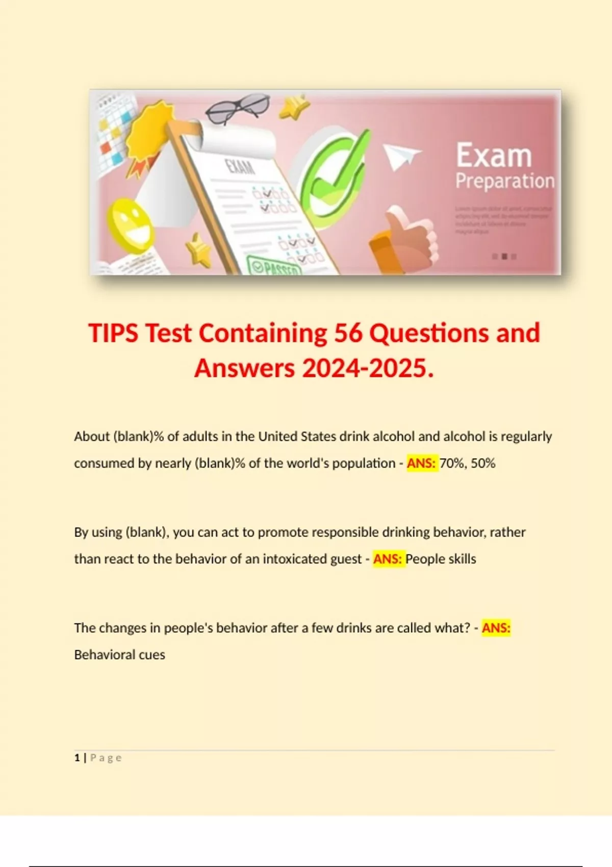 TIPS Test Containing 56 Questions and Answers . Terms like: About (blank)% of adults in the United States drink alcohol and alcohol is regularly consumed by nearly (blank)% of the world's population - ANS: 70%, 50% By using (blank), you can act to promote responsible drinking behavior, rather than react to the behavior of an intoxicated guest - ANS: People skills The changes in people's behavior after a few drinks are called what? - ANS: Behavioral cues