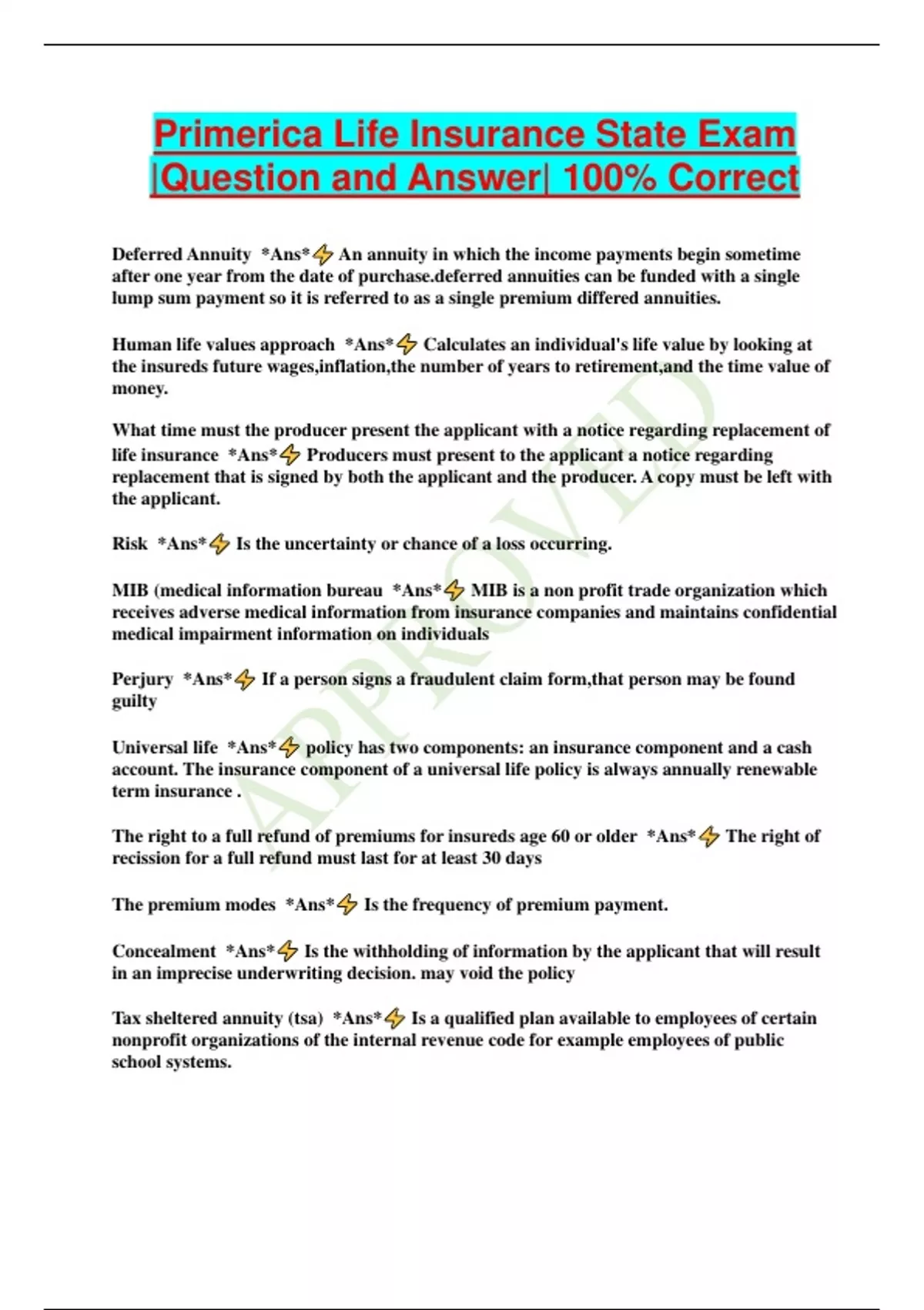 Primerica Life Insurance State Exam |Question and Answer| 100% Correct Deferred Annuity *Ans* An annuity in which the income payments begin sometime after one year from the date of red annuities can be funded with a single lump sum payment so it is referred to as a single premium differed annuities. Human life values approach *Ans* Calculates an individual's life value by looking at the insureds future wages,inflation,the number of years to retirement,and the time value of money. What time must the producer present the applicant with a notice regarding replacement of life insurance *Ans* Producers must present to the applicant a notice regarding replacement that is signed by both the applicant and the producer. A copy must be left with the applicant. Risk *Ans* Is the uncertainty or chance of a loss occurring. MIB (medical information bureau *Ans* MIB is a non profit trade organization which receives adverse medical information from insurance companies and maintains confidential medical impairment information on individuals Perjury *Ans* If a person signs a fraudulent claim form,that person may be found guilty Universal life *Ans* policy has two components: an insurance component and a cash account. The insurance component of a universal life policy is always annually renewable term insurance . The right to a full refund of premiums for insureds age 60 or older *Ans* The right of recission for a full refund must last for at least 30 days The premium modes *Ans* Is the frequency of premium payment. Concealment *Ans* Is the withholding of information by the applicant that will result in an imprecise underwriting decision. may v