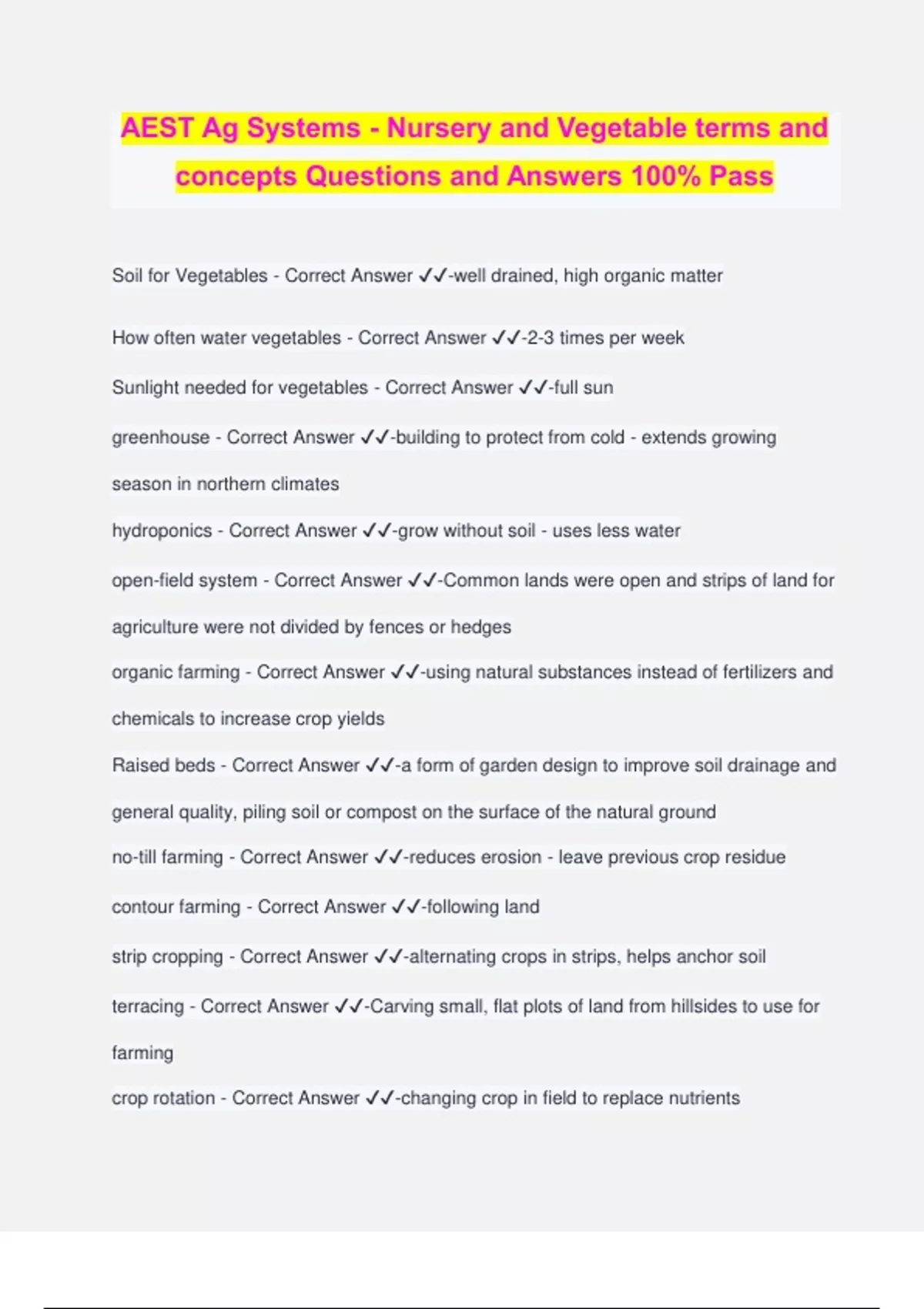 AEST Ag Systems - Nursery and Vegetable terms and concepts Questions and Answers 100% Pass Soil for Vegetables - Correct Answer ️️ -well drained, high organic matter How often water vegetables - Correct Answer ️️ -2-3 times per week Sunlight needed for vegetables - Correct Answer ️️ -full sun greenhouse - Correct Answer ️️ -building to protect from cold - extends growing season in northern climates hydroponics - Correct Answer ️️ -grow without soil - uses less water open-field system - Correct Answer ️️ -Common lands were open and strips of land for agriculture were not divided by fences or hedges organic farming - Correct Answer ️️ -using natural substances instead of fertilizers and chemicals to increase crop yields Raised beds - Correct Answer ️️ -a form of garden design to improve soil drainage and general quality, piling soil or compost on the surface of the natural ground no-till farming - Correct Answer ️️ -reduces erosion - leave previous crop residue contour farming - Correct Answer ️️ -following land strip cropping - Correct Answer ️️ -alternating crops in strips, helps anchor soil terracing - Correct Answer ️️ -Carving small, flat plots of land from hillsides to use for farming crop rotation - Correct Answer ️️ -changing crop in field to replace nutrients