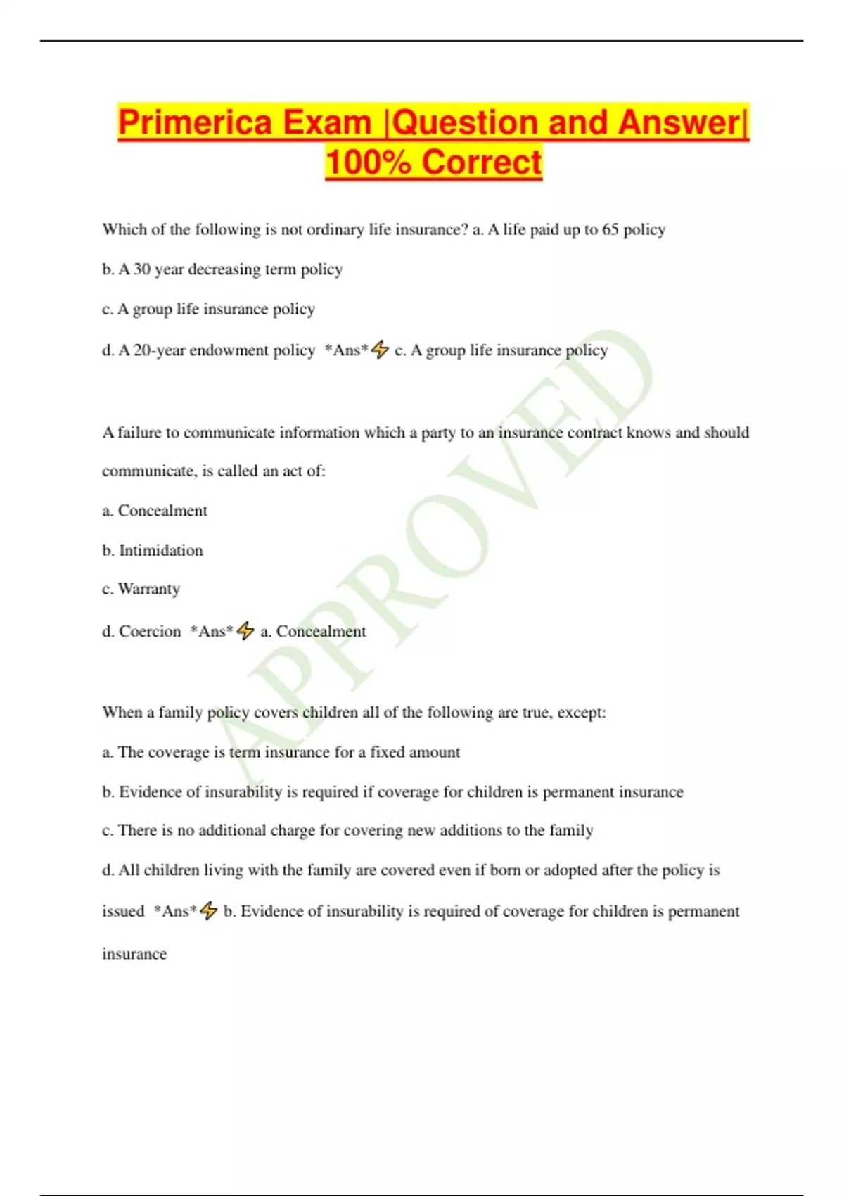 Primerica Exam |Question and Answer| 100% Correct Which of the following is not ordinary life insurance? a. A life paid up to 65 policy b. A 30 year decreasing term policy c. A group life insurance policy d. A 20-year endowment policy *Ans* c. A group life insurance policy A failure to communicate information which a party to an insurance contract knows and should communicate, is called an act of: a. Concealment b. Intimidation c. Warranty d. Coercion *Ans* a. Concealment When a family policy covers children all of the following are true, except: a. The coverage is term insurance for a fixed amount b. Evidence of insurability is required if coverage for children is permanent insurance c. There is no additional charge for covering new additions to the family d. All children living with the family are covered even if born or adopted after the policy is issued *Ans* b. Evidence of insurability is required of coverage for children is permanent insurance Which of the following is not one of the common personal uses of life insurance? a. Funding a buy/sell agreement b. Helping to fund a person's retirement c. Creating emergency funds to avoid the need to liquidate assets d. Creation of an immediate estate *Ans* a. Funding a buy/sell agreement An individual license is considered terminated: a. When transferred to another person b. When transferred to another license c. On the death of the licensee d. When transferred to a beneficiary *Ans* c. On the death of a licensee The movie company concerned about their financial losses in case of the illness of one of their actors would purchase: a. Surgery insurance b. Worker's compensation c. Miscellaneous insurance d. Credit insurance *Ans* a. Surety insurance What must insurer do who accepts an application from an agent who is not specifically appointed by the insurer and then issued a policy from the application? a. The agent must become an employee of that company within 30 days or re-submit the application b. Add the agent's name on the company's list of approved agents c. Send the agent an employee approval notice within 30 days of the policy issuance d. Forward to the Insurance Commissioner a Notice of Appointment within the 14 days of receipt of application *Ans* d. Forward to the Insurance Commissioner a Notice of Appointment within 14 days of receipt of application Which of the following is considered ordinary life insurance? a. Mortgage insurance b. Continuous premium whole life c. Group insurance d. 30-year decreasing term insurance *Ans* a. Mortgage insurance Which of the following is a true statement regarding the Social Security (OASDHI) program? a. The program fully funded b. Except for a few exemptions, it is a voluntary program c. The program provides a minimum floor of income and is meant to supplement a retirees own personal program d. The actuarial value of each person's contribution is equal to the actual value of each person's benefit *Ans* c. The program provides a minimum floor of income and is meant to supplement a retirees own personal program Which party has the rights in a life insurance policy only after the death of the insured? a. The policy owner