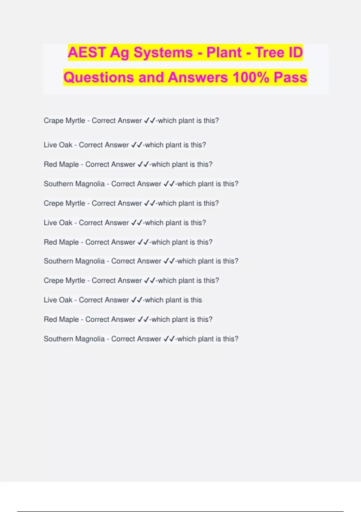 AEST Ag Systems - Plant - Tree ID Questions and Answers 100% Pass Crape Myrtle - Correct Answer ️️ -which plant is this? Live Oak - Correct Answer ️️ -which plant is this? Red Maple - Correct Answer ️️ -which plant is this? Southern Magnolia - Correct Answer ️️ -which plant is this? Crepe Myrtle - Correct Answer ️️ -which plant is this? Live Oak - Correct Answer ️️ -which plant is this? Red Maple - Correct Answer ️️ -which plant is this? Southern Magnolia - Correct Answer ️️ -which plant is this?