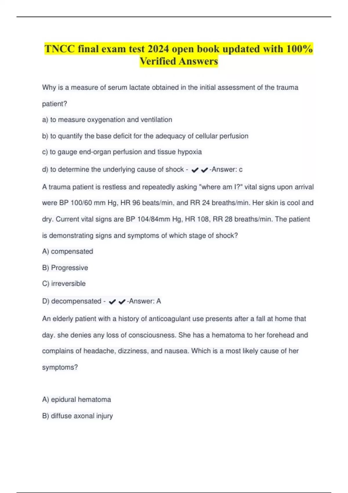 TNCC final exam test 2024 open book updated with 100% Verified Answers Why is a measure of serum lactate obtained in the initial assessment of the trauma patient? a) to measure oxygenation and ventilation b) to quantify the base deficit for the adequacy of cellular perfusion c) to gauge end-organ perfusion and tissue hypoxia d) to determine the underlying cause of shock - ️️ -Answer: c A trauma patient is restless and repeatedly asking "where am I?" vital signs upon arrival were BP 100/60 mm Hg, HR 96 beats/min, and RR 24 breaths/min. Her skin is cool and dry. Current vital signs are BP 104/84mm Hg, HR 108, RR 28 breaths/min. The patient is demonstrating signs and symptoms of which stage of shock? A) compensated B) Progressive C) irreversible D) decompensated - ️️ -Answer: A An elderly patient with a history of anticoagulant use presents after a fall at home that day. she denies any loss of consciousness. She has a hematoma to her forehead and complains of headache, dizziness, and nausea. Which is a most likely cause of her symptoms? A) epidural hematoma B) diffuse axonal injury C) post-concussive syndrome D) subdural hematoma - ️️ -Answer: D EMS brings a patient who fell riding his bicycle. Using the American College of Surgeons screening guidelines, which assessment finding would prompt the nurse to prepare the patient for radiologic spine clearance? A) Alert with no neurologic deficits B) Multiple abrasions to the extremities C) Multiple requests of water D) Smell of alcohol on breath - ️️ -Answer: D Which of the following occurs during the third impact of a motor vehicle crash? A) The driver of the vehicle collides with the ste