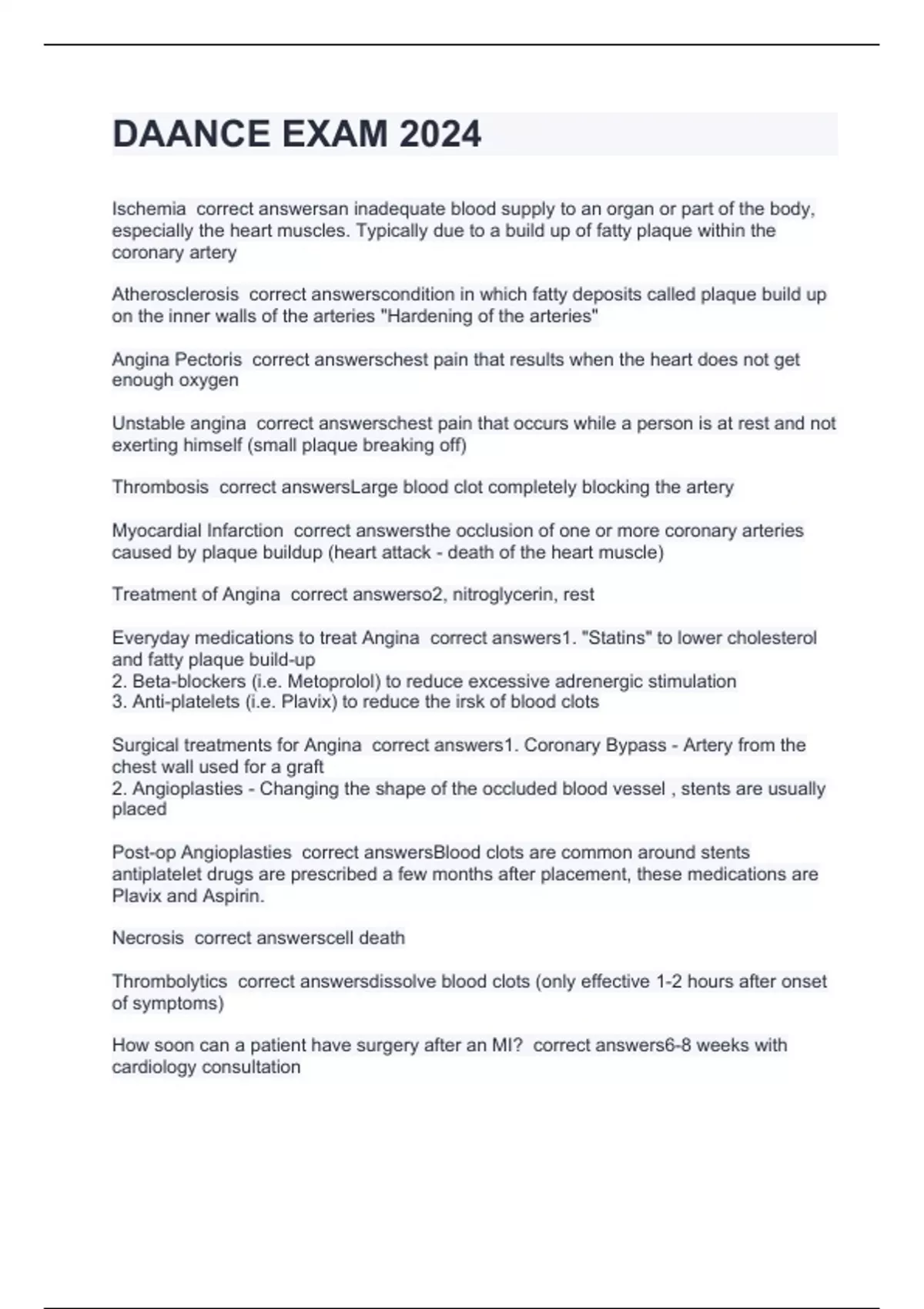 Ischemia correct answersan inadequate blood supply to an organ or part of the body, especially the heart muscles. Typically due to a build up of fatty plaque within the coronary artery Atherosclerosis correct answerscondition in which fatty deposits called plaque build up on the inner walls of the arteries "Hardening of the arteries" Angina Pectoris correct answerschest pain that results when the heart does not get enough oxygen Unstable angina correct answerschest pain that occurs while a person is at rest and not exerting himself (small plaque breaking off) Thrombosis correct answersLarge blood clot completely blocking the artery Myocardial Infarction correct answersthe occlusion of one or more coronary arteries caused by plaque buildup (heart attack - death of the heart muscle) Treatment of Angina correct answerso2, nitroglycerin, rest Everyday medications to treat Angina correct answers1. "Statins" to lower cholesterol and fatty plaque build-up 2. Beta-blockers (i.e. Metoprolol) to reduce excessive adrenergic stimulation 3. Anti-platelets (i.e. Plavix) to reduce the irsk of blood clots Surgical treatments for Angina correct answers1. Coronary Bypass - Artery from the chest wall used for a graft 2. Angioplasties - Changing the shape of the occluded blood vessel , stents are usually placed Post-op Angioplasties correct answersBlood clots are common around stents antiplatelet drugs are prescribed a few months after placement, these medications are Plavix and Aspirin. Necrosis correct answerscell death Thrombolytics correct answersdissolve blood clots (only effective 1-2 hours after onset of symptoms) How soon can a patient have surgery after an MI? correct answers6-8 weeks with cardiology consultation