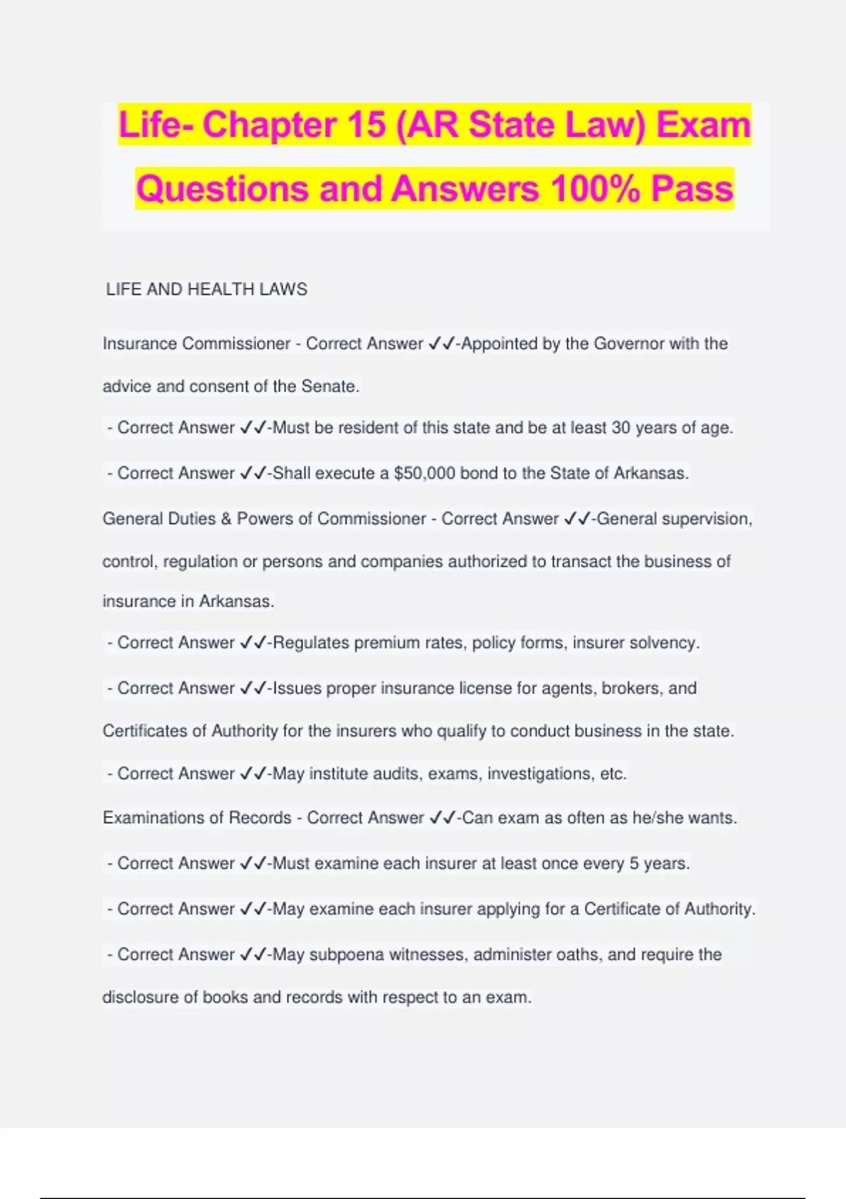 Life- Chapter 15 (AR State Law) Exam Questions and Answers 100% Pass LIFE AND HEALTH LAWS Insurance Commissioner - Correct Answer ️️ -Appointed by the Governor with the advice and consent of the Senate. - Correct Answer ️️ -Must be resident of this state and be at least 30 years of age. - Correct Answer ️️ -Shall execute a $50,000 bond to the State of Arkansas. General Duties & Powers of Commissioner - Correct Answer ️️ -General supervision, control, regulation or persons and companies authorized to transact the business of insurance in Arkansas. - Correct Answer ️️ -Regulates premium rates, policy forms, insurer solvency. - Correct Answer ️️ -Issues proper insurance license for agents, brokers, and Certificates of Authority for the insurers who qualify to conduct business in the state. - Correct Answer ️️ -May institute audits, exams, investigations, etc. Examinations of Records - Correct Answer ️️ -Can exam as often as he/she wants. - Correct Answer ️️ -Must examine each insurer at least once every 5 years. - Correct Answer ️️ -May examine each insurer applying for a Certificate of Authority. - Correct Answer ️️ -May subpoena witnesses, administer oaths, and require the disclosure of books and records with respect to an exam. - Correct Answer ️️ -Self Incrimination- any person who asks to be excused from attending, testifying, or producing any documents in connection with any exam. Hearings/Notice of Hearings/Orders - Correct Answer ️️ -May hold hearing for any purpose within scope of the Insurance. - Correct Answer ️️ -Must hold hearing within 30 days of its demand and give notice of date, time, location 10 days in advance. - Correct Answer ️️ -Will make his/her order within 30 days after the end of the hearing. - Correct Answer ️️ -Appeal will take place within 30 days after the notice of appeal has been received by commissioner. Penalties - Correct Answer ️️ -Refusal, suspension or revocation of license or Certificate of Authority. - Correct Answer ️️ -Fine of up to $1,000 for each violation. - Correct Answer ️️ -Order for restitution of actual losses to affected persons. State-Specific Definitions - Correct Answer ️️ - Insurance Transaction - Correct Answer ️️ -Solicitation, preliminar