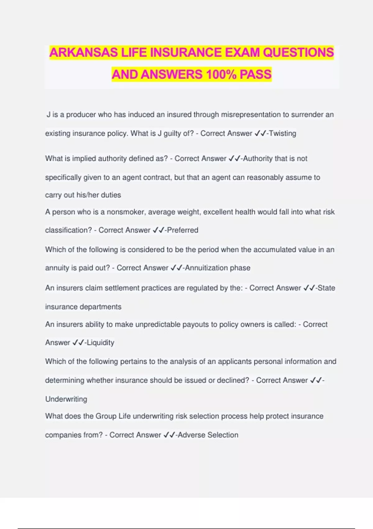 ARKANSAS LIFE INSURANCE EXAM QUESTIONS AND ANSWERS 100% PASS J is a producer who has induced an insured through misrepresentation to surrender an existing insurance policy. What is J guilty of? - Correct Answer ️️ -Twisting What is implied authority defined as? - Correct Answer ️️ -Authority that is not specifically given to an agent contract, but that an agent can reasonably assume to carry out his/her duties A person who is a nonsmoker, average weight, excellent health would fall into what risk classification? - Correct Answer ️️ -Preferred Which of the following is considered to be the period when the accumulated value in an annuity is paid out? - Correct Answer ️️ -Annuitization phase An insurers claim settlement practices are regulated by the: - Correct Answer ️️ -State insurance departments An insurers ability to make unpredictable payouts to policy owners is called: - Correct Answer ️️ -Liquidity Which of the following pertains to the analysis of an applicants personal information and determining whether insurance should be issued or declined? - Correct Answer ️️ - Underwriting What does the Group Life underwriting risk selection process help protect insurance companies from? - Correct Answer ️️ -Adverse Selection The Arkansas Life & Disability Insurance Guaranty Association assures payment of benefits from insurance policies for insolvent insurers, and covers all of the following insured policies, EXCEPT: - Correct Answer ️️ -Liability Insurance What would happen if a life insurance applicant is given a conditional receipt from an insurance agent and then dies the next day? - Correct Answer ️️ -Claim will be paid if application is approved A life insurance policy owner does NOT have the right to: - Correct Answer ️️ -Revoke an absolute assignment An employee under a group insurance policy has the right to name a beneficiary and the right to: - Correct Answer ️️ -Convert to an individual policy in the event of employment termination The two major actions required for a policyholder to comply with the Reinstatement Clause are - Correct Answer ️️ -Provide evidence of insurability, past due premiums Pat owns a 20-pay life policy with a paid-up dividend option. Which of the following statements is true? - Correct Answer ️️ -The policy may be paid up early by using policy dividends Ron has a life insurance policy with a face value of $100,000 and a cost of living rider. If the consumer price index has gone up 4%, how much may Ron increase the face value of the policy? - Correct Answer ️️ -$4,000 ($100,000 X .04 = $4,000)