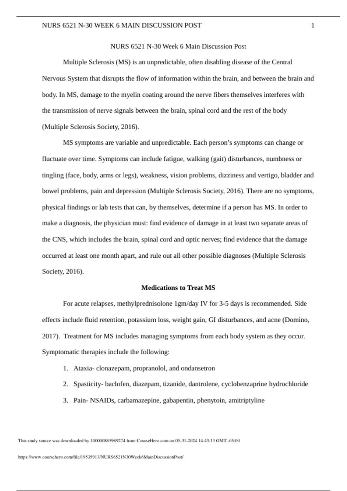 NURS 6521 N-30 Week 6 Main Discussion Post Multiple Sclerosis (MS) is an unpredictable, often disabling disease of the Central Nervous System that disrupts the flow of information within the brain, and between the brain and body. In MS, damage to the my