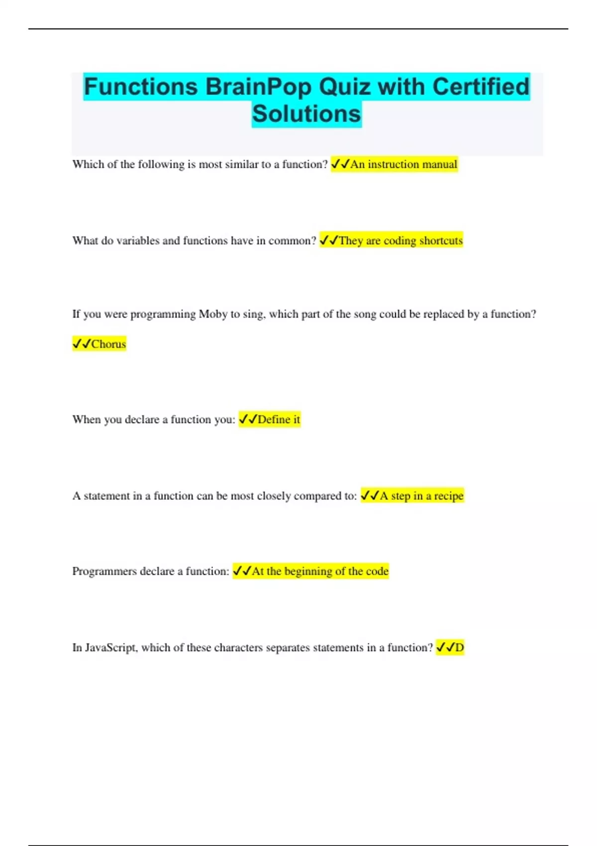 Functions BrainPop Quiz with Certified Solutions Which of the following is most similar to a function? An instruction manual What do variables and functions have in common? They are coding shortcuts If you were programming Moby to sing, which part of the song could be replaced by a function? Chorus When you declare a function you: Define it A statement in a function can be most closely compared to: A step in a recipe Programmers declare a function: At the beginning of the code In JavaScript, which of these characters separates statements in a function? D What would you type to call this function? wave (); What can you deduce about this function? It is a combination of other functions What is a benefit of DRYing up code? It saves programmers