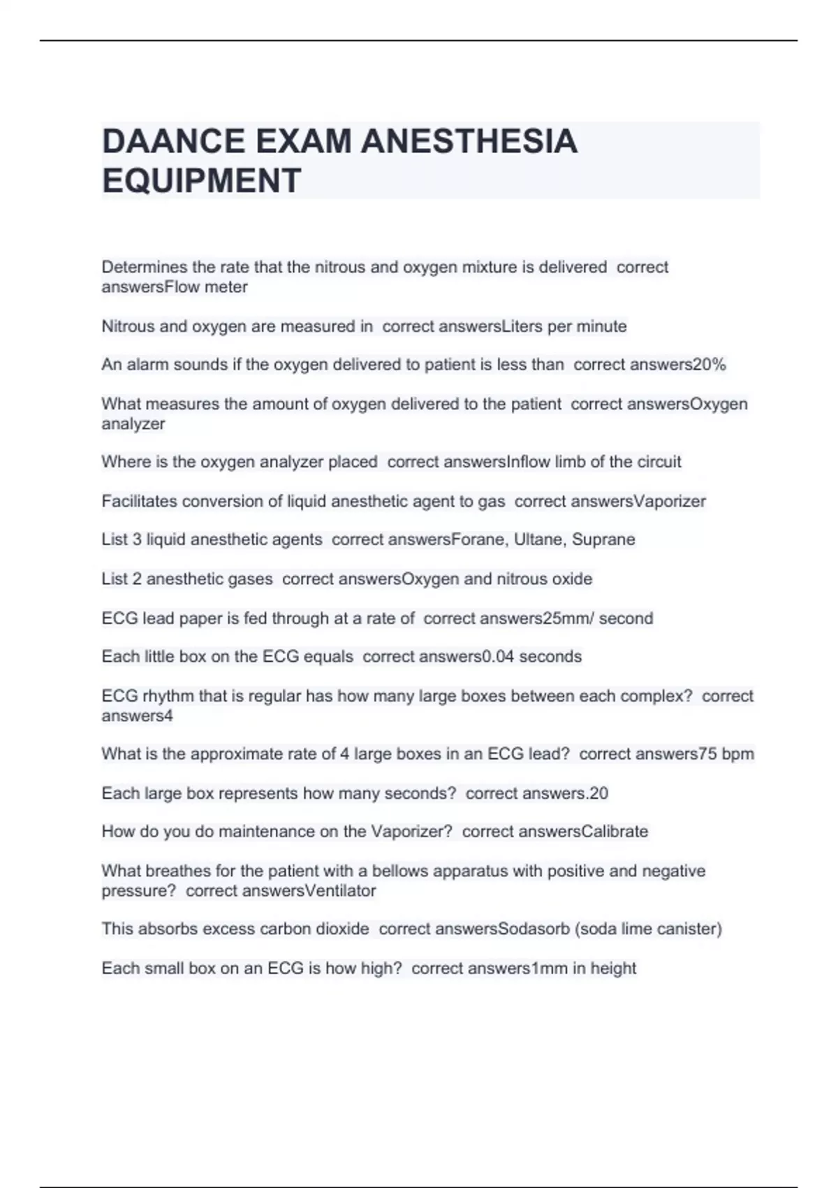 Determines the rate that the nitrous and oxygen mixture is delivered correct answersFlow meter Nitrous and oxygen are measured in correct answersLiters per minute An alarm sounds if the oxygen delivered to patient is less than correct answers20% What measures the amount of oxygen delivered to the patient correct answersOxygen analyzer Where is the oxygen analyzer placed correct answersInflow limb of the circuit Facilitates conversion of liquid anesthetic agent to gas correct answersVaporizer List 3 liquid anesthetic agents correct answersForane, Ultane, Suprane List 2 anesthetic gases correct answersOxygen and nitrous oxide ECG lead paper is fed through at a rate of correct answers25mm/ second Each little box on the ECG equals correct answers0.04 seconds ECG rhythm that is regular has how many large boxes between each complex? correct answers4 What is the approximate rate of 4 large boxes in an ECG lead? correct answers75 bpm Each large box represents how many seconds? correct answers.20 How do you do maintenance on the Vaporizer? correct answersCalibrate What breathes for the patient with a bellows apparatus with positive and negative pressure? correct answersVentilator This absorbs excess carbon dioxide correct answersSodasorb (soda lime canister) Each small box on an ECG is how high? correct answers1mm in height