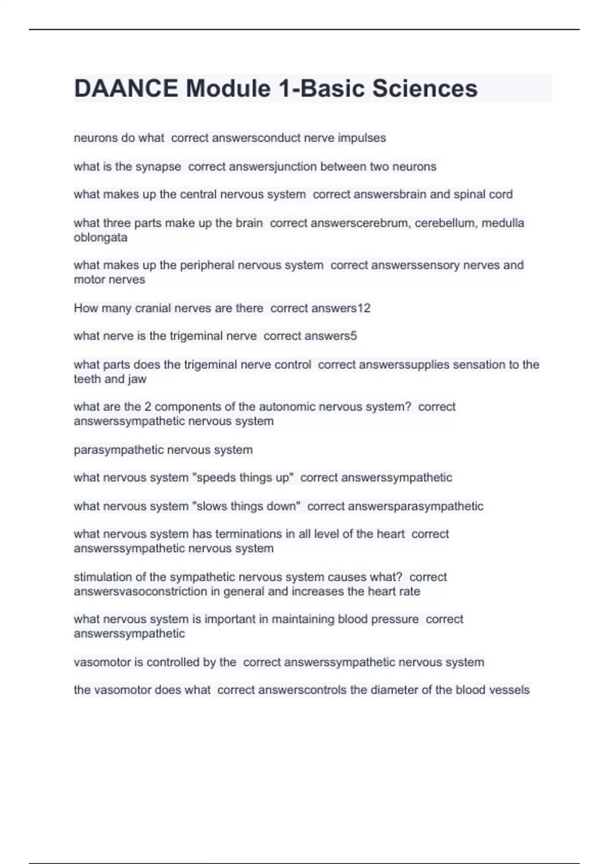 neurons do what correct answersconduct nerve impulses what is the synapse correct answersjunction between two neurons what makes up the central nervous system correct answersbrain and spinal cord what three parts make up the brain correct answerscerebrum, cerebellum, medulla oblongata what makes up the peripheral nervous system correct answerssensory nerves and motor nerves How many cranial nerves are there correct answers12 what nerve is the trigeminal nerve correct answers5 what parts does the trigeminal nerve control correct answerssupplies sensation to the teeth and jaw what are the 2 components of the autonomic nervous system? correct answerssympathetic nervous system parasympathetic nervous system what nervous system "speeds things up" correct answerssympathetic what nervous system "slows things down" correct answersparasympathetic what nervous system has terminations in all level of the heart correct answerssympathetic nervous system stimulation of the sympathetic nervous system causes what? correct answersvasoconstriction in general and increases the heart rate what nervous system is important in maintaining blood pressure correct answerssympathetic vasomotor is controlled by the correct answerssympathetic nervous system the vasomotor does what correct answerscontrols the diameter of the blood vessels