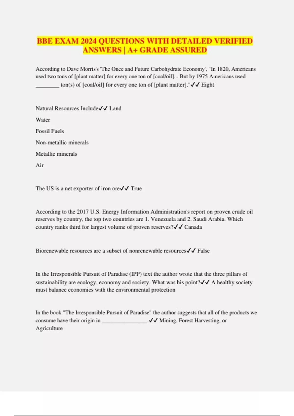 BBE EXAM 2024 QUESTIONS WITH DETAILED VERIFIED ANSWERS | A+ GRADE ASSURED According to Dave Morris's 'The Once and Future Carbohydrate Economy', "In 1820, Americans used two tons of [plant matter] for every one ton of [coal/oil]... But by 1975 Americans used ________ ton(s) of [coal/oil] for every one ton of [plant matter]." Eight Natural Resources Include Land Water Fossil Fuels Non-metallic minerals Metallic minerals Air The US is a net exporter of iron ore True According to the 2017 U.S. Energy Information Administration's report on proven crude oil reserves by country, the top two countries are 1. Venezuela and 2. Saudi Arabia. Which country ranks third for largest volume of proven reserves? Canada Biorenewable resources are a subset of nonrenewable resources False In the Irresponsible Pursuit of Paradise (IPP) text the author wrote that the three pillars of sustainability are ecology, economy and society. What was his point? A healthy society must balance economics with the environmental protection In the book "The Irresponsible Pursuit of Paradise" the author suggests that all of the products we consume have their origin in ________________. Mining, Forest Harvesting, or Agriculture