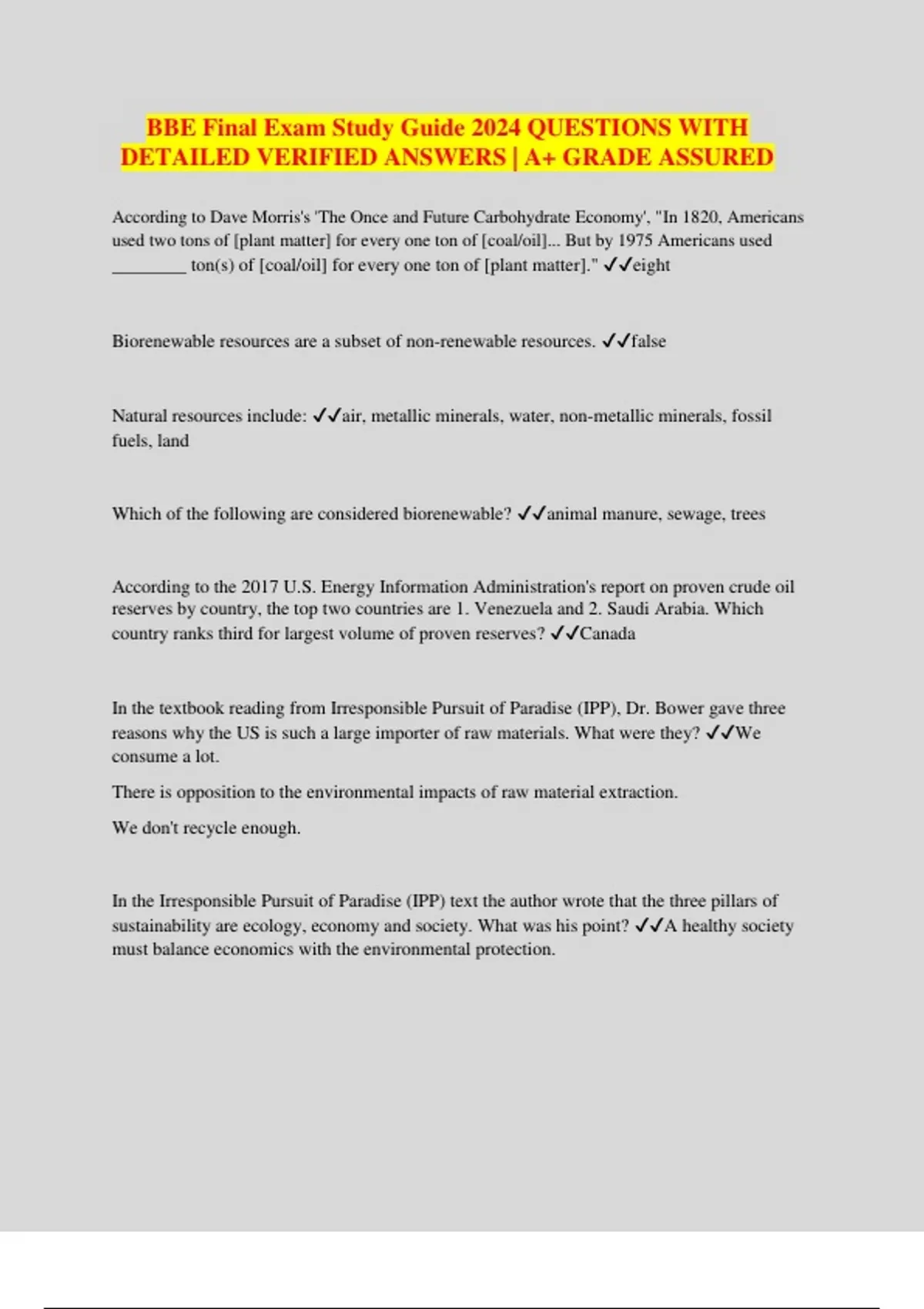BBE Final Exam Study Guide 2024 QUESTIONS WITH DETAILED VERIFIED ANSWERS | A+ GRADE ASSURED According to Dave Morris's 'The Once and Future Carbohydrate Economy', "In 1820, Americans used two tons of [plant matter] for every one ton of [coal/oil]... But by 1975 Americans used ________ ton(s) of [coal/oil] for every one ton of [plant matter]." eight Biorenewable resources are a subset of non-renewable resources. false Natural resources include: air, metallic minerals, water, non-metallic minerals, fossil fuels, land Which of the following are considered biorenewable? animal manure, sewage, trees According to the 2017 U.S. Energy Information Administration's report on proven crude oil reserves by country, the top two countries are 1. Venezuela and 2. Saudi Arabia. Which country ranks third for largest volume of proven reserves? Canada In the textbook reading from Irresponsible Pursuit of Paradise (IPP), Dr. Bower gave three reasons why the US is such a large importer of raw materials. What were they? We consume a lot. There is opposition to the environmental impacts of raw material extraction. We don't recycle enough. In the Irresponsible Pursuit of Paradise (IPP) text the author wrote that the three pillars of sustainability are ecology, economy and society. What was his point? A healthy society must balance economics with the environmental protection
