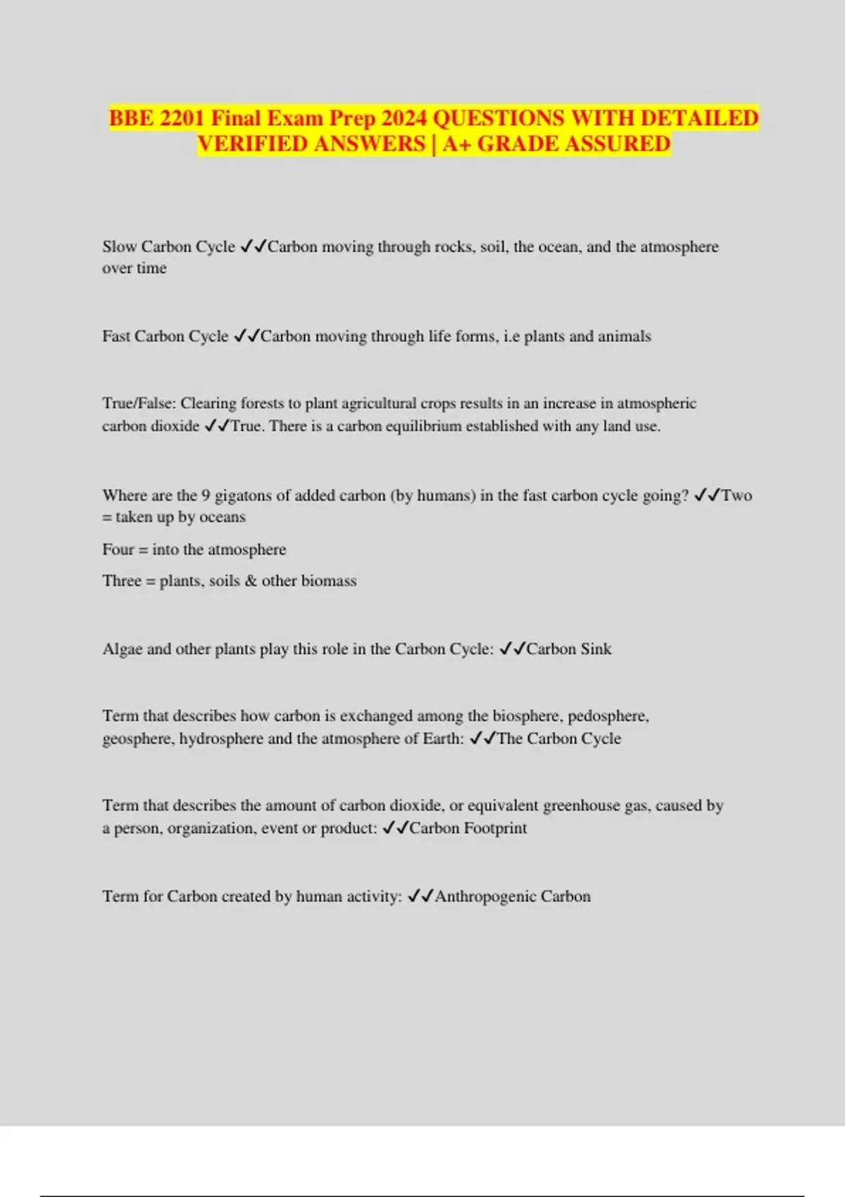 BBE 2201 Final Exam Prep 2024 QUESTIONS WITH DETAILED VERIFIED ANSWERS | A+ GRADE ASSURED Slow Carbon Cycle Carbon moving through rocks, soil, the ocean, and the atmosphere over time Fast Carbon Cycle Carbon moving through life forms, i.e plants and animals True/False: Clearing forests to plant agricultural crops results in an increase in atmospheric carbon dioxide True. There is a carbon equilibrium established with any land use. Where are the 9 gigatons of added carbon (by humans) in the fast carbon cycle going? Two = taken up by oceans Four = into the atmosphere Three = plants, soils & other biomass Algae and other plants play this role in the Carbon Cycle: Carbon Sink Term that describes how carbon is exchanged among the biosphere, pedosphere, geosphere, hydrosphere and the atmosphere of Earth: The Carbon Cycle Term that describes the amount of carbon dioxide, or equivalent greenhouse gas, caused by a person, organization, event or product: Carbon Footprint Term for Carbon created by human activity: Anthropogenic Carbon