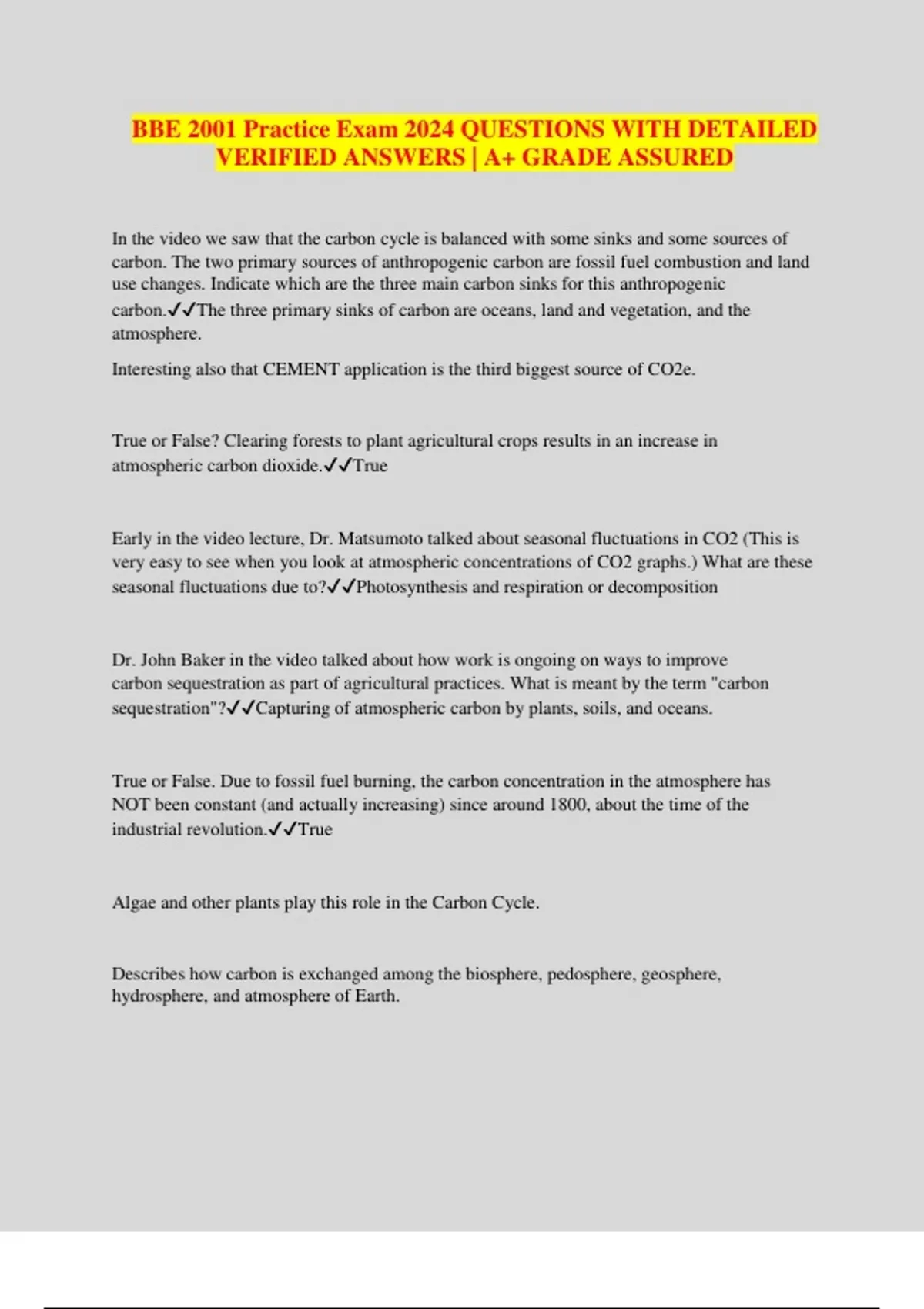 BBE 2001 Practice Exam 2024 QUESTIONS WITH DETAILED VERIFIED ANSWERS | A+ GRADE ASSURED In the video we saw that the carbon cycle is balanced with some sinks and some sources of carbon. The two primary sources of anthropogenic carbon are fossil fuel combustion and land use changes. Indicate which are the three main carbon sinks for this anthropogenic carbon.The three primary sinks of carbon are oceans, land and vegetation, and the atmosphere. Interesting also that CEMENT application is the third biggest source of CO2e. True or False? Clearing forests to plant agricultural crops results in an increase in atmospheric carbon dioxide.True Early in the video lecture, Dr. Matsumoto talked about seasonal fluctuations in CO2 (This is very easy to see when you look at atmospheric concentrations of CO2 graphs.) What are these seasonal fluctuations due to?Photosynthesis and respiration or decomposition Dr. John Baker in the video talked about how work is ongoing on ways to improve carbon sequestration as part of agricultural practices. What is meant by the term "carbon sequestration"?Capturing of atmospheric carbon by plants, soils, and oceans. True or False. Due to fossil fuel burning, the carbon concentration in the atmosphere has NOT been constant (and actually increasing) since around 1800, about the time of the industrial revolution.True Algae and other plants play this role in the Carbon Cycle. Describes how carbon is exchanged among the biosphere, pedosphere, geosphere, hydrosphere, and atmosphere of Earth.