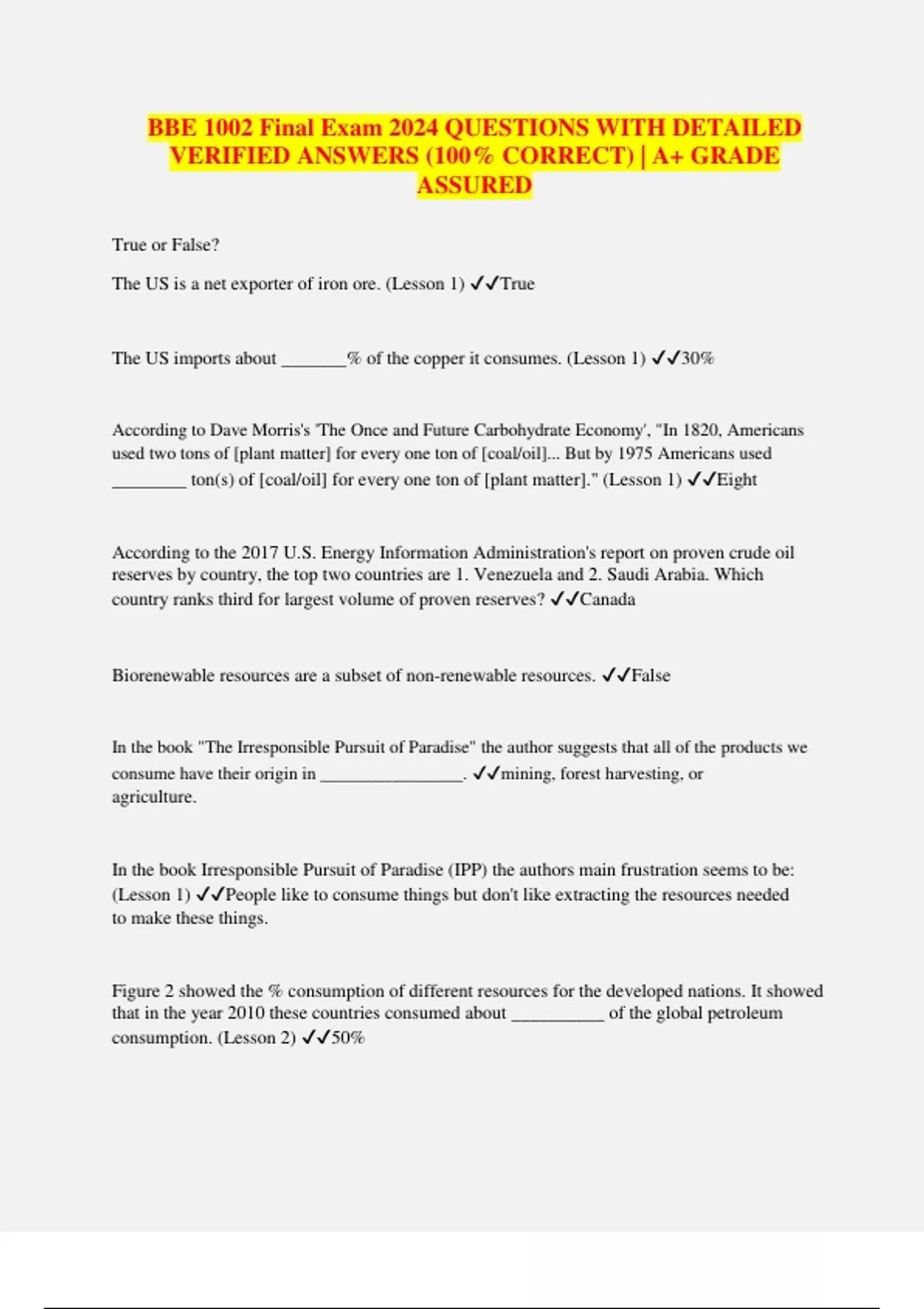 BBE 1002 Final Exam 2024 QUESTIONS WITH DETAILED VERIFIED ANSWERS (100% CORRECT) | A+ GRADE ASSURED True or False? The US is a net exporter of iron ore. (Lesson 1) True The US imports about _______% of the copper it consumes. (Lesson 1) 30% According to Dave Morris's 'The Once and Future Carbohydrate Economy', "In 1820, Americans used two tons of [plant matter] for every one ton of [coal/oil]... But by 1975 Americans used ________ ton(s) of [coal/oil] for every one ton of [plant matter]." (Lesson 1) Eight According to the 2017 U.S. Energy Information Administration's report on proven crude oil reserves by country, the top two countries are 1. Venezuela and 2. Saudi Arabia. Which country ranks third for largest volume of proven reserves? Canada Biorenewable resources are a subset of non-renewable resources. False In the book "The Irresponsible Pursuit of Paradise" the author suggests that all of the products we consume have their origin in ________________. mining, forest harvesting, or agriculture. In the book Irresponsible Pursuit of Paradise (IPP) the authors main frustration seems to be: (Lesson 1) People like to consume things but don't like extracting the resources needed to make these things. Figure 2 showed the % consumption of different resources for the developed nations. It showed that in the year 2010 these countries consumed about __________ of the global petroleum consumption. (Lesson 2) 50%