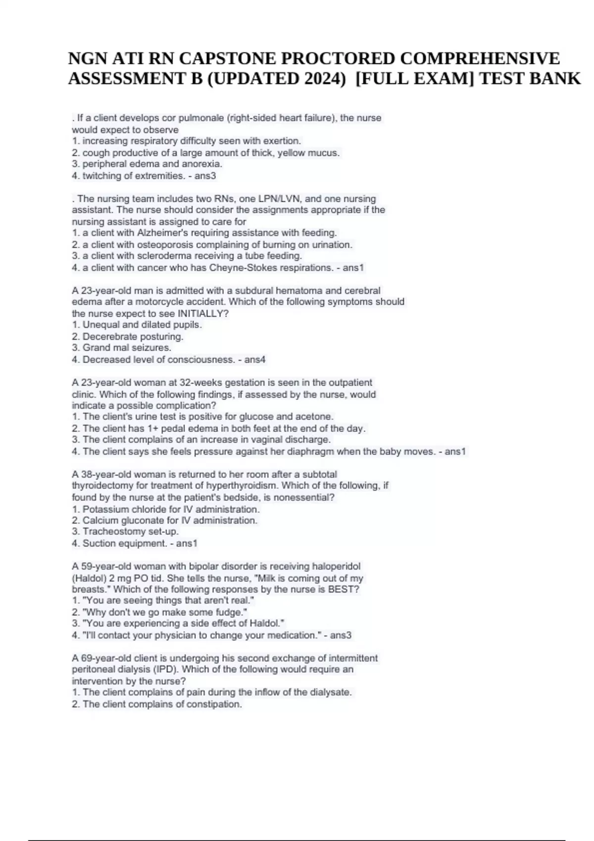 NGN ATI RN CAPSTONE PROCTORED COMPREHENSIVE ASSESSMENT B (UPDATED 2024) [FULL EXAM] TEST BANK. If a client develops cor pulmonale (right-sided heart failure), the nurse would expect to observe 1. increasing respiratory difficulty seen with exertion. 2. cough productive of a large amount of thick, yellow mucus. 3. peripheral edema and anorexia. 4. twitching of extremities. - ans3 . The nursing team includes two RNs, one LPN/LVN, and one nursing assistant. The nurse should consider the assignments appropriate if the nursing assistant is assigned to care for 1. a client with Alzheimer's requiring assistance with feeding. 2. a client with osteoporosis complaining of burning on urination. 3. a client with scleroderma receiving a tube feeding. 4. a client with cancer who has Cheyne-Stokes respirations. - ans1 A 23-year-old man is admitted with a subdural hematoma and cerebral edema after a motorcycle accident. Which of the following symptoms should the nurse expect to see INITIALLY? 1. Unequal and dilated pupils. 2. Decerebrate posturing. 3. Grand mal seizures. 4. Decreased level of consciousness. - ans4 A 23-year-old woman at 32-weeks gestation is seen in the outpatient clinic. Which of the following findings, if assessed by the nurse, would indicate a possible complication? 1. The client's urine test is positive for glucose and acetone. 2. The client has 1+ pedal edema in both feet at the end of the day. 3. The client complains of an increase in vaginal discharge. 4. The client says she feels pressure against her diaphragm when the baby moves. - ans1 A 38-year-old woman is returned to her room after a subtotal thyroidectomy for treatment of hyperthyroidism. Which of the following, if found by the nurse at the patient's bedside, is nonessential? 1. Potassium chloride for IV administration. 2. Calcium gluconate for IV administration. 3. Tracheostomy set-up. 4. Suction equipment. - ans1 A 59-year-old woman with bipolar disorder is receiving haloperidol (Haldol) 2 mg PO tid. She tells the nurse, "Milk is coming out of my breasts." Which of the following responses by the nurse is BEST? 1. "You are seeing things that aren't real." 2. "Why don't we go make some fudge." 3. "You are experiencing a side effect of Haldol." 4. "I'll contact your physician to change your medication." - ans3 A 69-year-old client is undergoing his second exchange of intermittent peritoneal dialysis (IPD). Which of the following would require an intervention by the nurse? 1. The client complains of pain during the inflow of the dialysate. 2. The client complains of constipation. NGN ATI RN CAPSTONE PROCTORED COMPREHENSIVE ASSESSMENT B (UPDATED 2024) [FULL EXAM] TEST BANK 3. The dialysate outflow is cloudy. 4. There is blood-tinged fluid around the intra-abdominal catheter. - ans3 A charge nurse is discussing the responsibility of nurses carig for clients who have C. difficile. Which of the following information should the nurse include in the teaching? a) Assign the client to a room with a negative air-flow system b) Use alcohol-based hand sanitizer when leaving the clients room c) clean contaminated surfaces in the clients room with a phenol solution d) have family members wear a gown and gloves when visiting - ansD A client diagnosed with dementia wanders the halls of the locked nursing unit during the day. To ensure the client's safety while walking in the halls, the nurse should do which of the following? 1. Administer PRN haloperidol (Haldol) to decrease the need to walk. 2. Assess the client's gait for steadiness. 3. Restrain the client in a geriatric chair. 4. Administer PRN lorazepam (Ativan) to provide sedation. - ans2 A client has a history of oliguria, hypertension, and peripheral edema. Current lab values are: BUN -25, K+ -4.0 mEq/L. Which nutrient should be restricted in the client's diet? 1. Protein. 2. Fats. 3. Carbohydrates. 4. Magnesium. - ans1 a client has a new prescription for spironilactone ( aldactone ) which of the following laboratory value should the nurse recognized as a reason to withhold the morning dose of the medication and notify the provider - ansserum potassium 5.2 a client has prescription for valproic ( Depakote) which of the following laboratory value should the nurse anticipate monitor for the client taking this medication - ansthrombocytes, amylase count and liver function test A client is admitted with a diagnosis of acute appendicitis. When assessing the abdomen, the nurse would expect to find rebound tenderness at which location? a) Left lower quadrant b) Left upper quadrant c) Right upper quadrant d) Right lower quadrant - ansD A client is being discharged with sublingual nitroglycerin (Nitrostat). The client should be cautioned by the nurse to 1. take the medication five minutes after the pain has started. 2. stop taking the medication if a stinging sensation is absent. 3. take the medication on an empty stomach. 4. avoid abrupt changes in posture. - ans4 A client is given morphine 6 mg IV push for postoperative pain. Following administration of this drug, the nurse observes the following: pulse 68, respirations 8, BP 100/68, client sleeping quietly. Which of the following nursing actions is MOST appropriate? 1. Allow the client to sleep undisturbed. 2. Administer oxygen via facemask or nasal prongs. 3. Administer naloxone (Narcan). 4. Place epinephrine 1:1,000 at the bedside. - ans3 A client is receiving total parenteral nutrition (TPN). To determine the client's tolerance of this treatment, the nurse should assess for which of the following? 1. A significant increase in pulse rate. 2. A decrease in diastolic blood pressure. 3. Temperature in excess of 98.6°F (37°C). 4. Urine output of at least 30 cc per hour. - ans4 A client is scheduled for a left lower lobectomy. The physician has ordered diazepam (Valium) 2 mg IM for anxiety. The nurse would determine that the medication is appropriate if the client displays which of the following symptoms? 1. Agitation and decreased level o